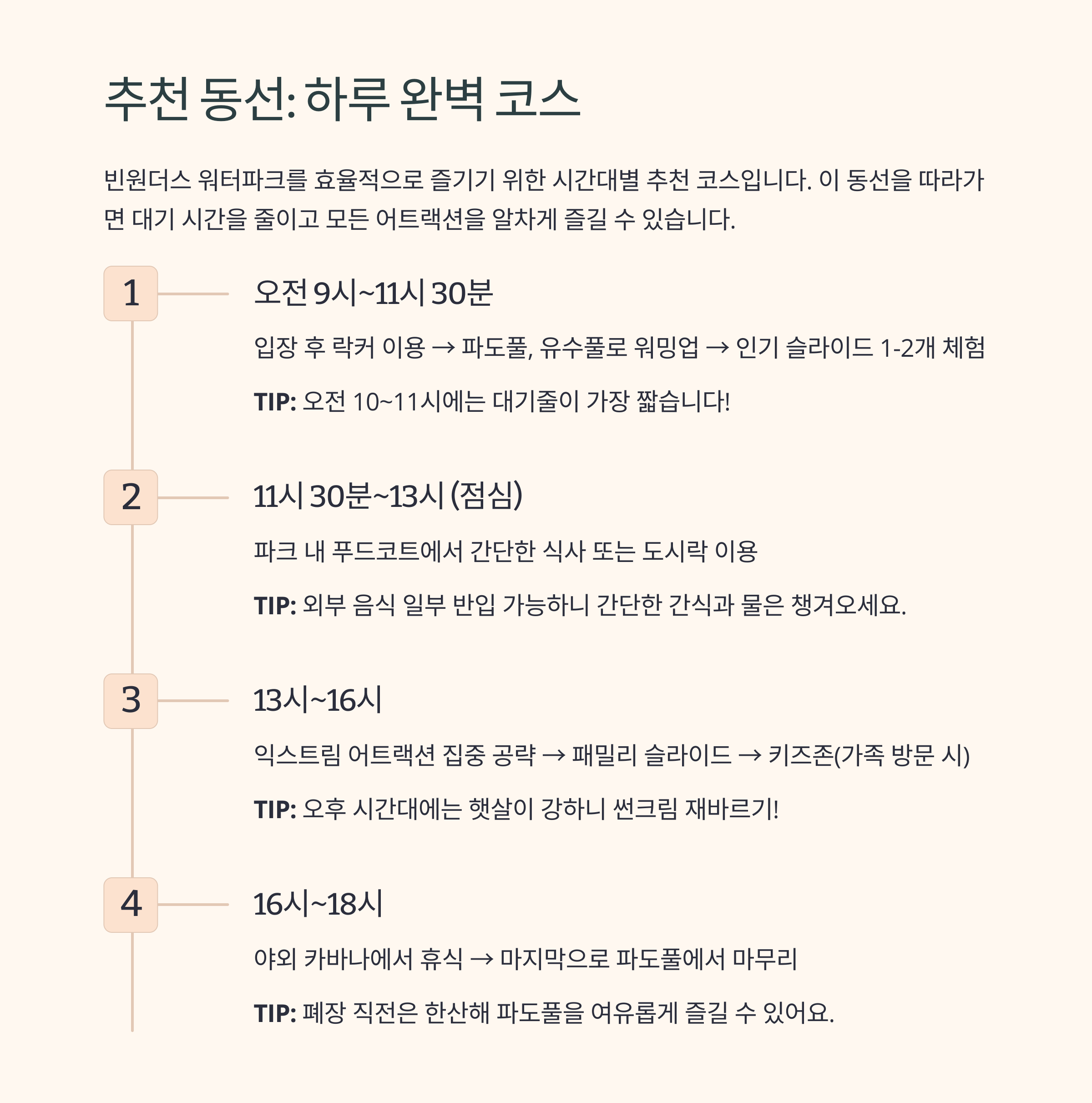 1부 (오전 9시~11시 30분)입장 후 락커 이용 → 파도풀, 유수풀로 워밍업 → 인기 슬라이드 12개 체험