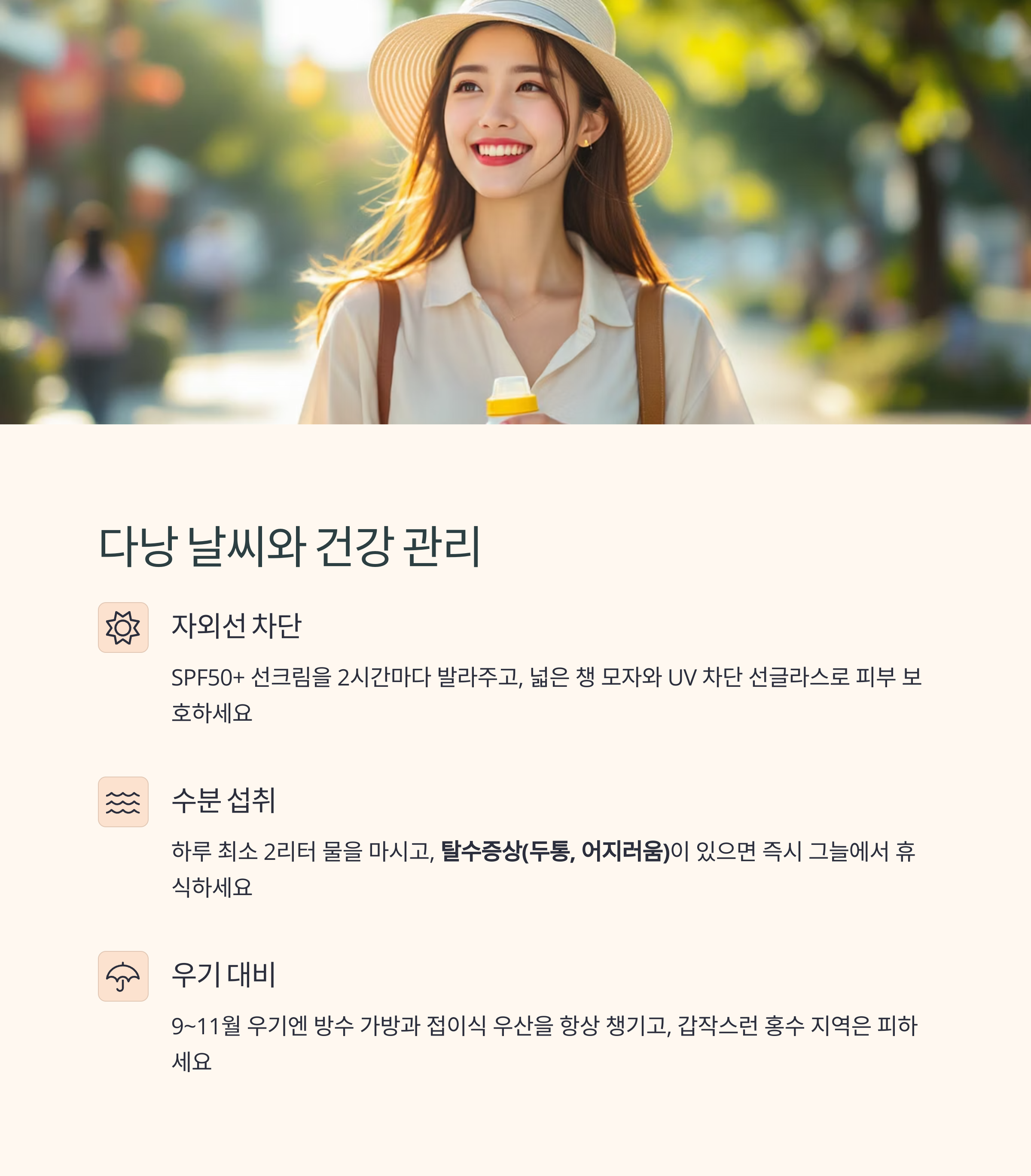 다낭은 고온다습한 날씨가 많아 탈수, 일사병, 급격한 피로가 쉽게 올 수 있어요