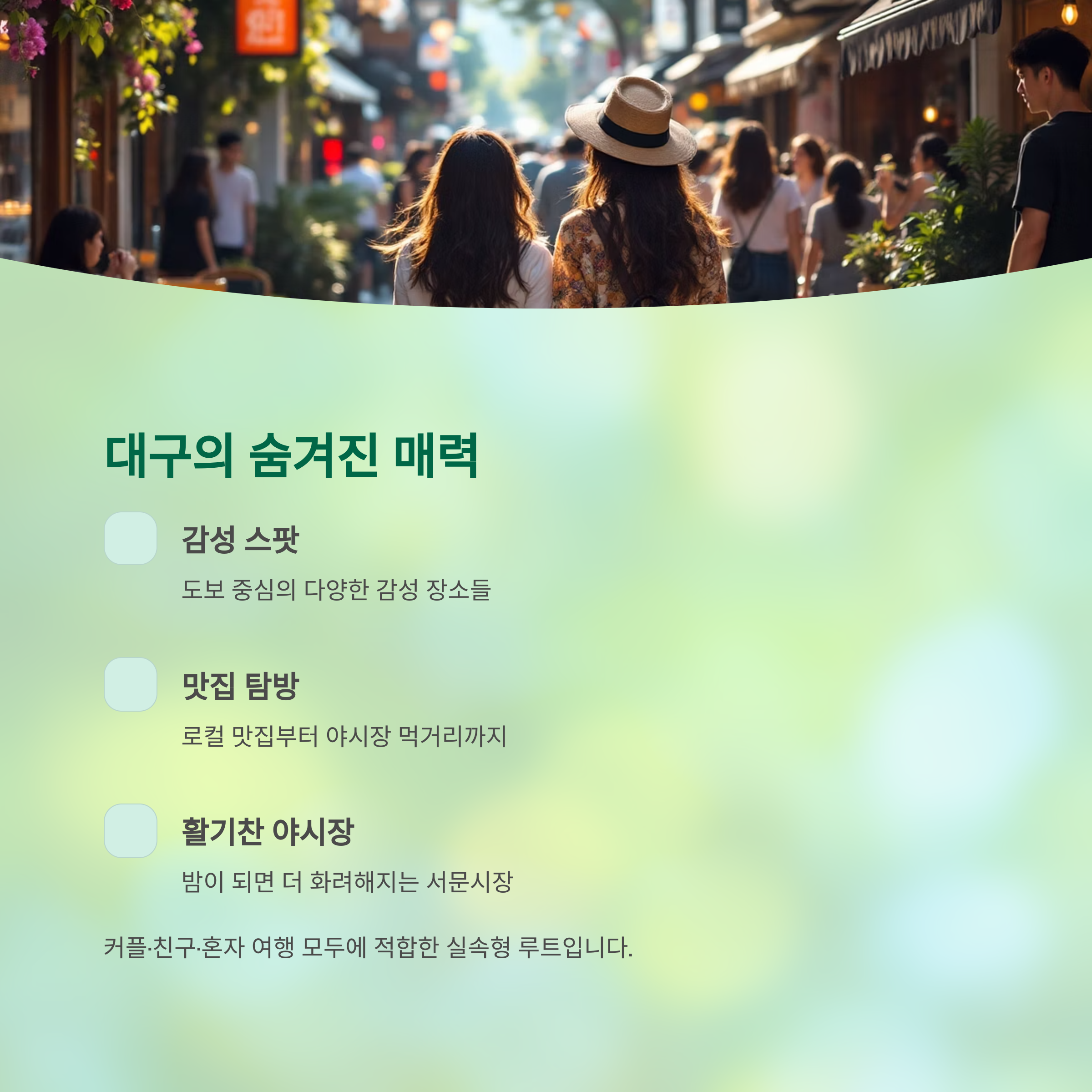 서문시장 야시장과 근교 핫플레이스까지 포함한 실속형 루트로, 커플·친구·혼자 여행 모두에 적합합니다.