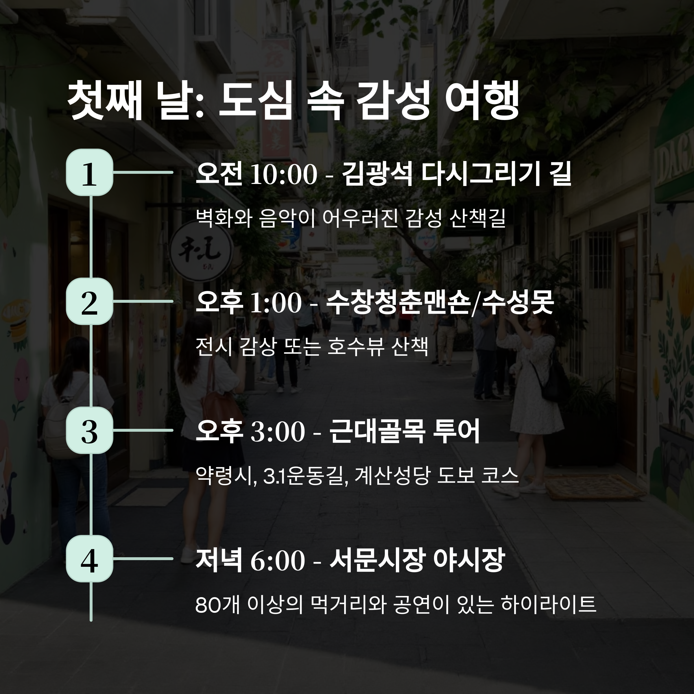 | Day 1 오후 | 근대골목, 수성못 | 역사와 여유의 조화 |