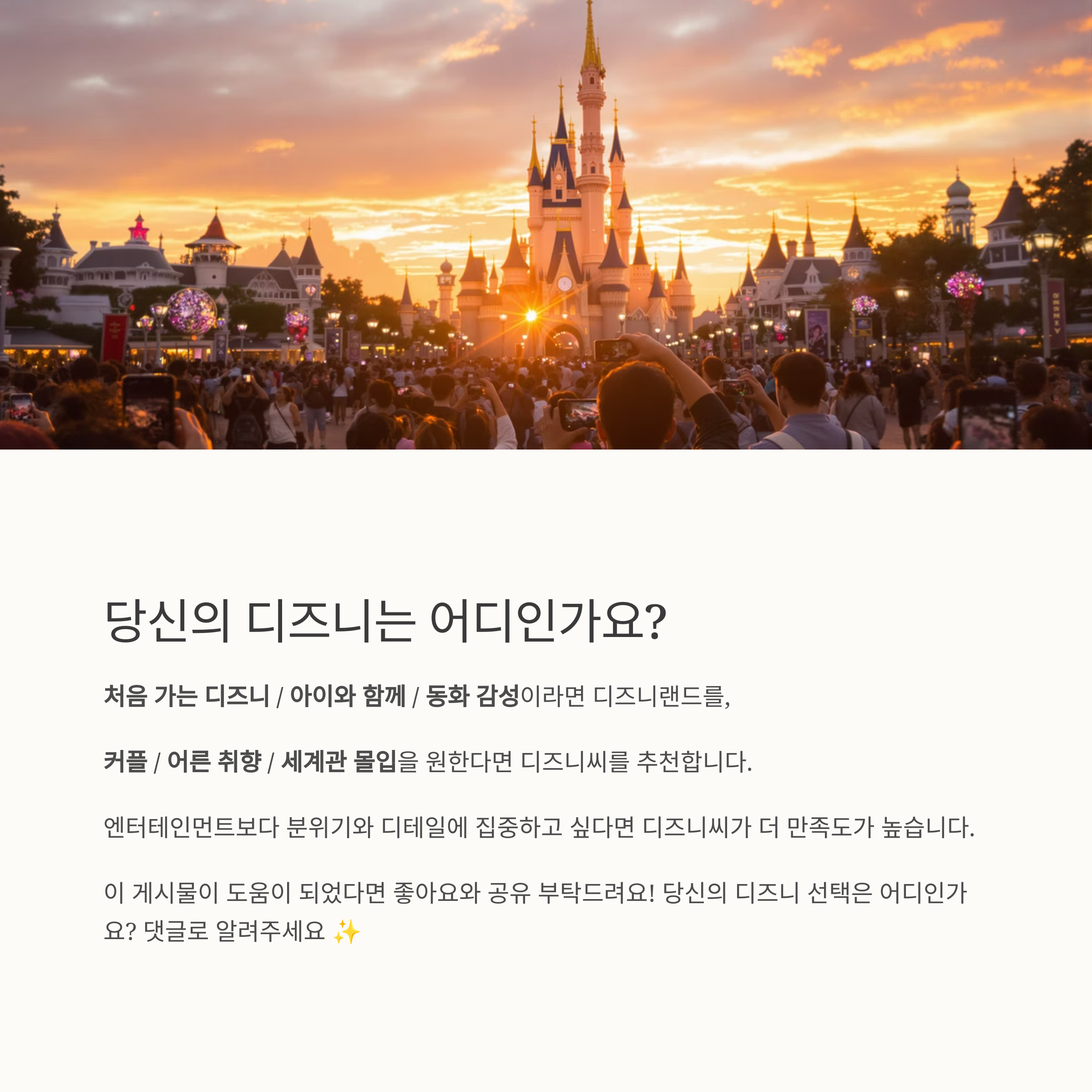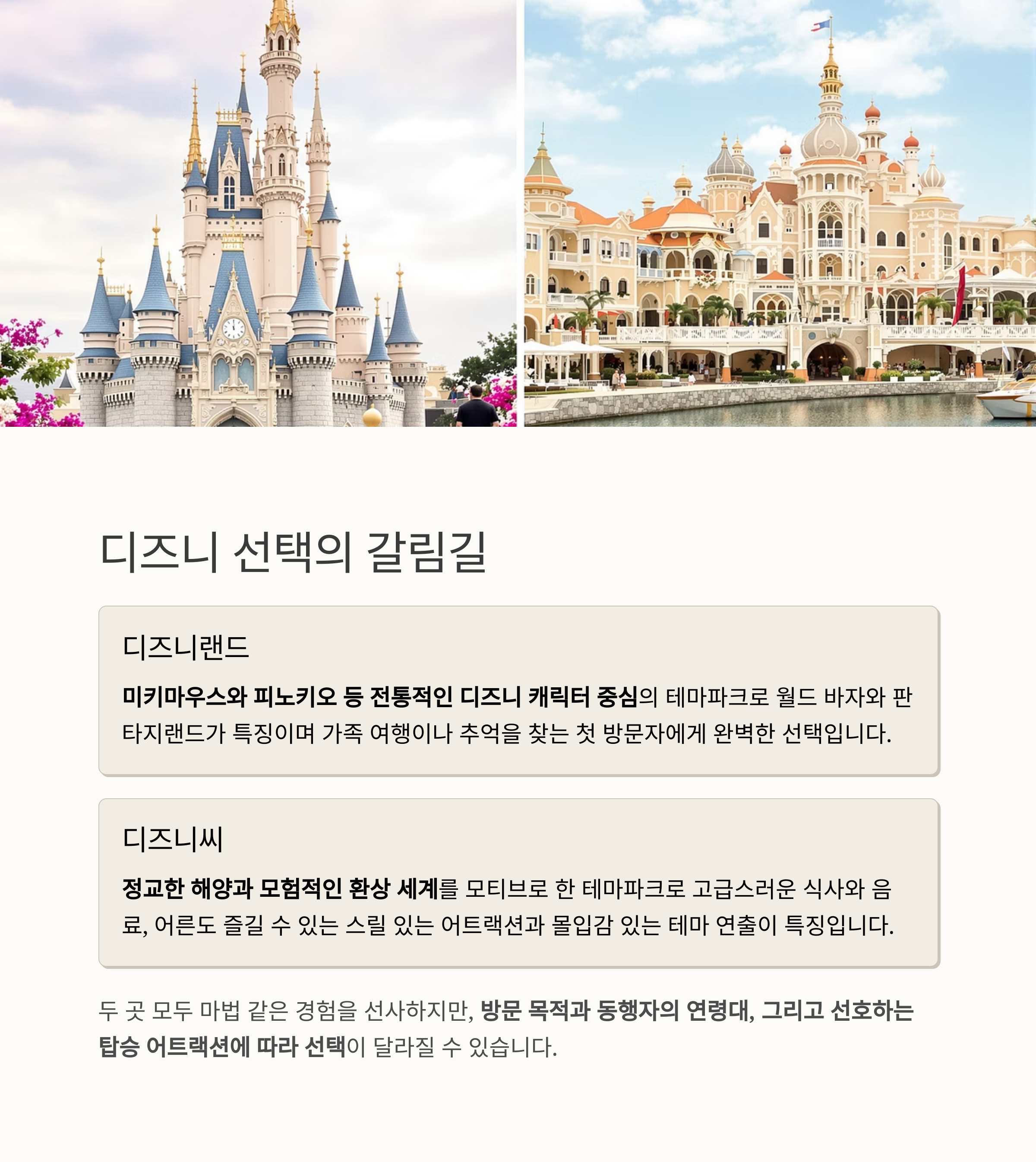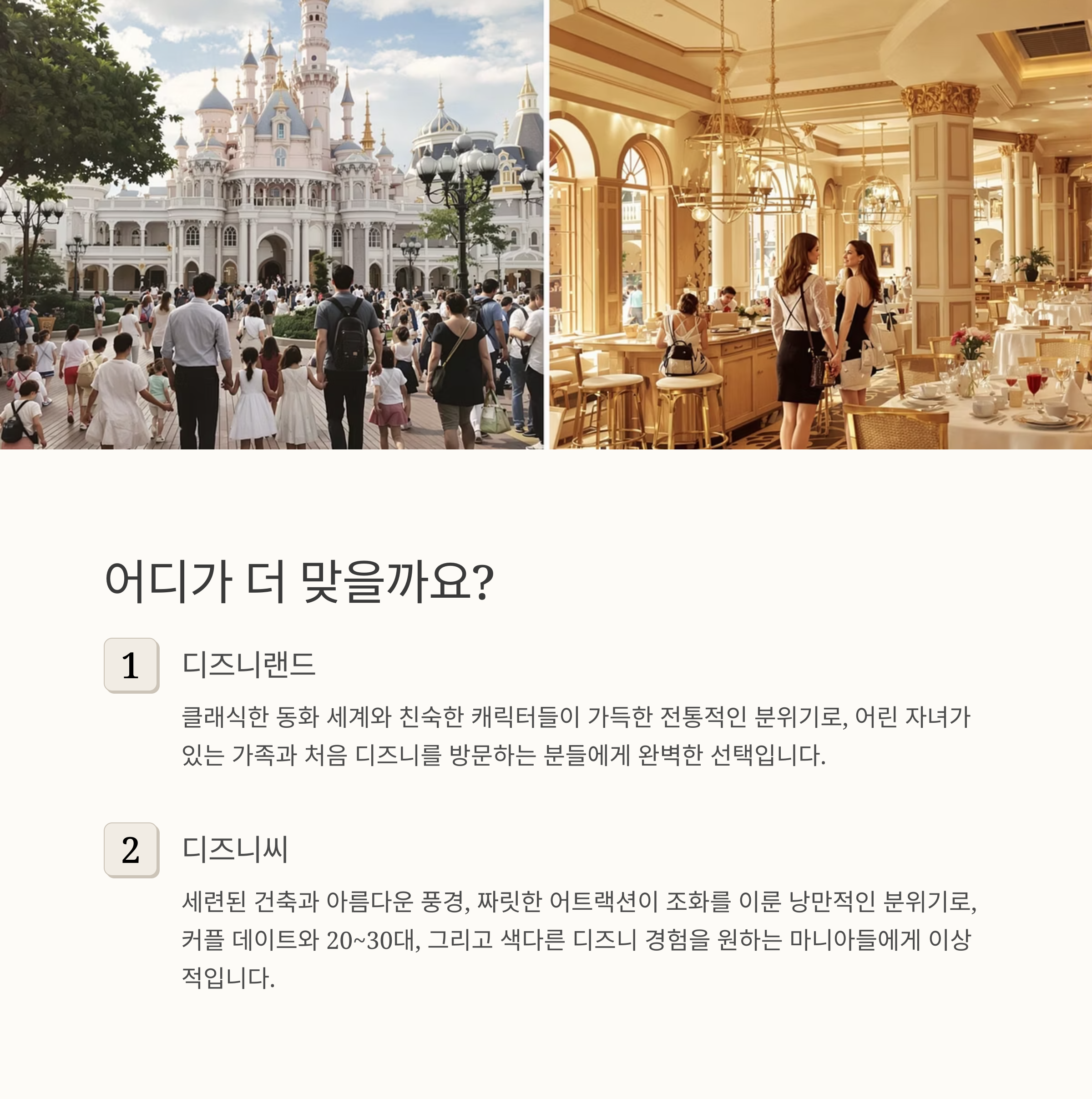 - 커플 / 어른 취향 / 세계관 몰입 → 디즈니씨 추천