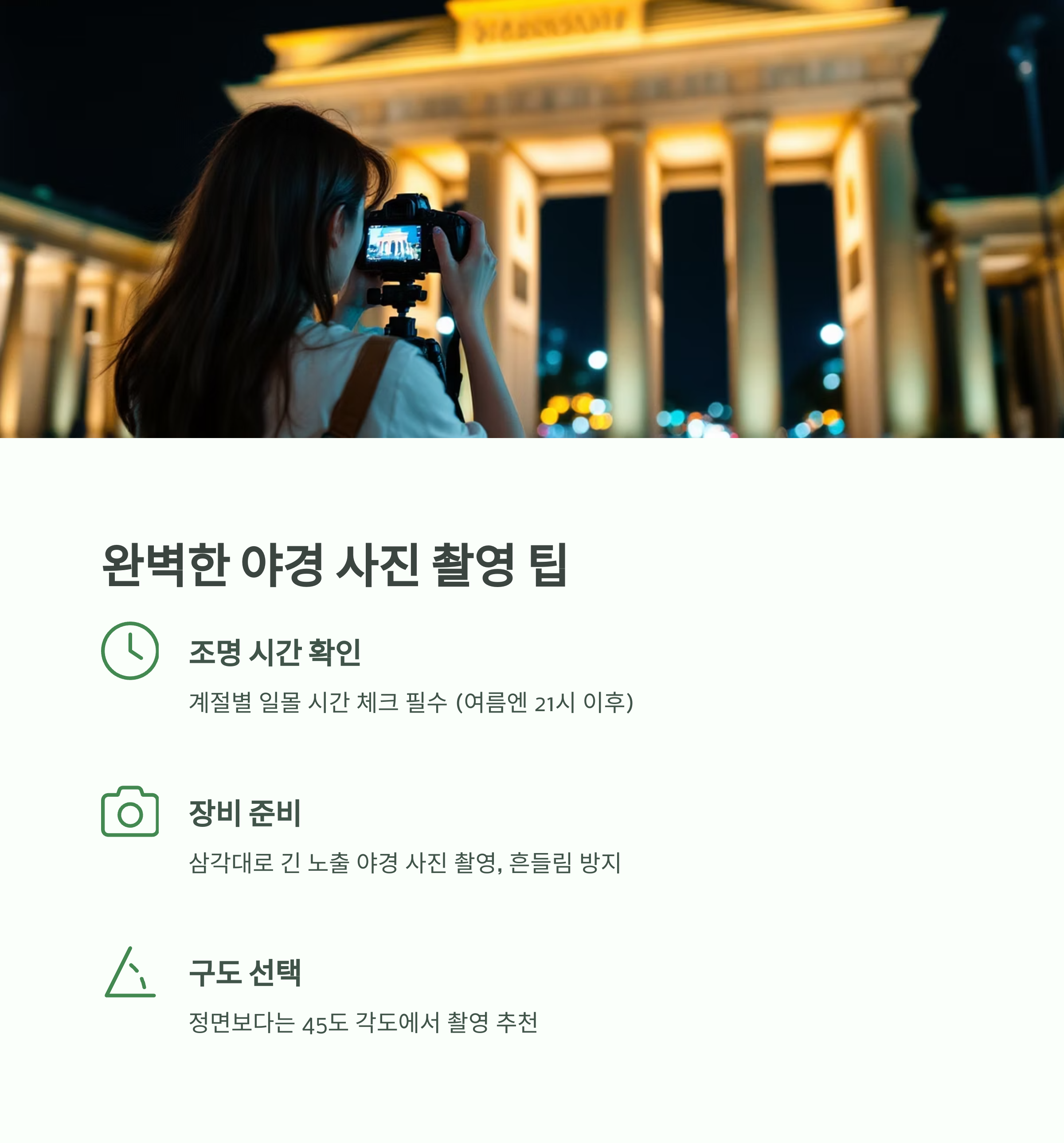 | 인물+건축 연출 | 정면보다는 45도 각도에서 촬영 추천 |