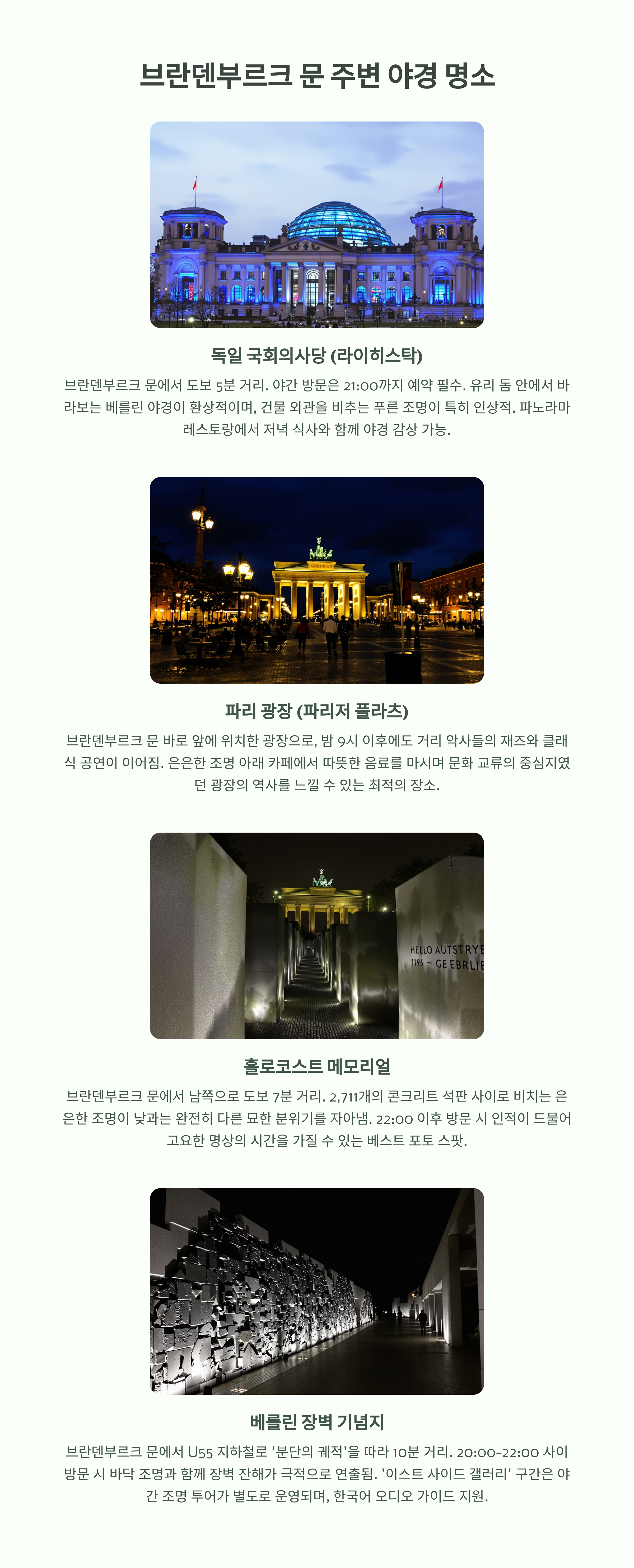 | 베를린 장벽 기념지 (East Side) | U-Bahn 환승 필요 | 드물지만 야경 배경으로 인기 있음 |