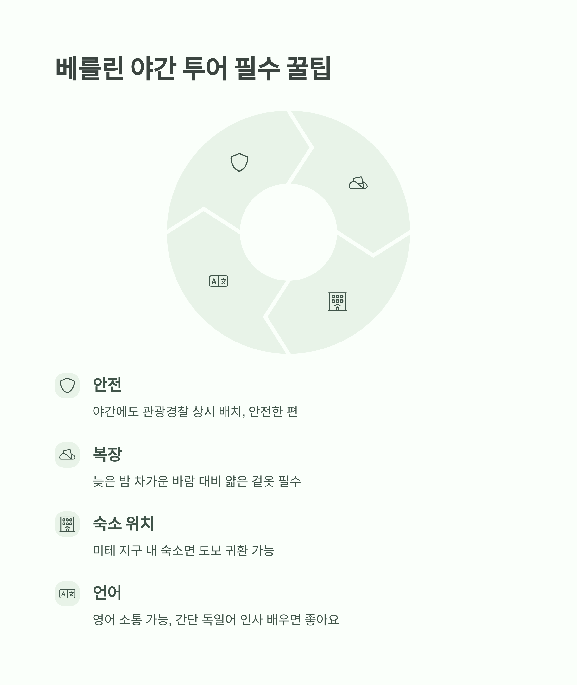 | 조명 시간 확인 | 계절별 일몰 시간 체크 필수 (독일은 여름엔 21시 이후) |