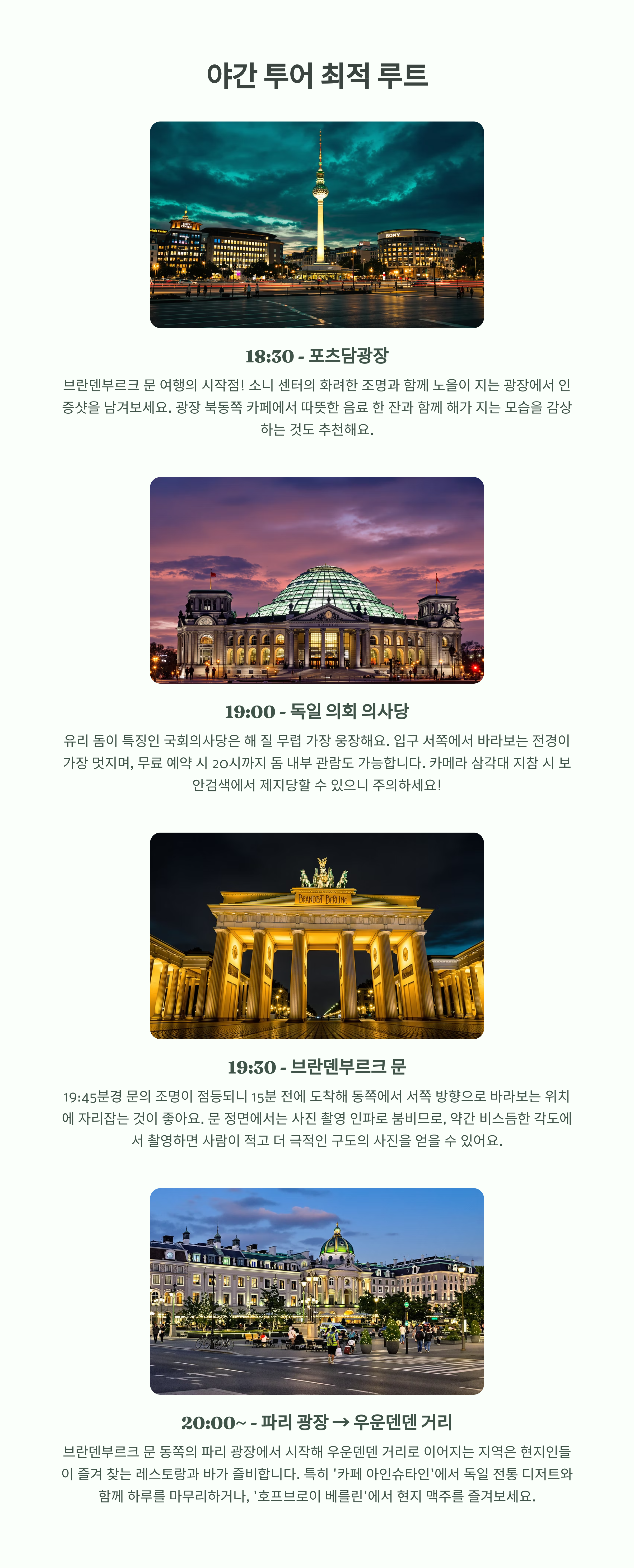 | 19:30 | 브란덴부르크 문 도착 | 조명 점등 직전 명당 확보 |