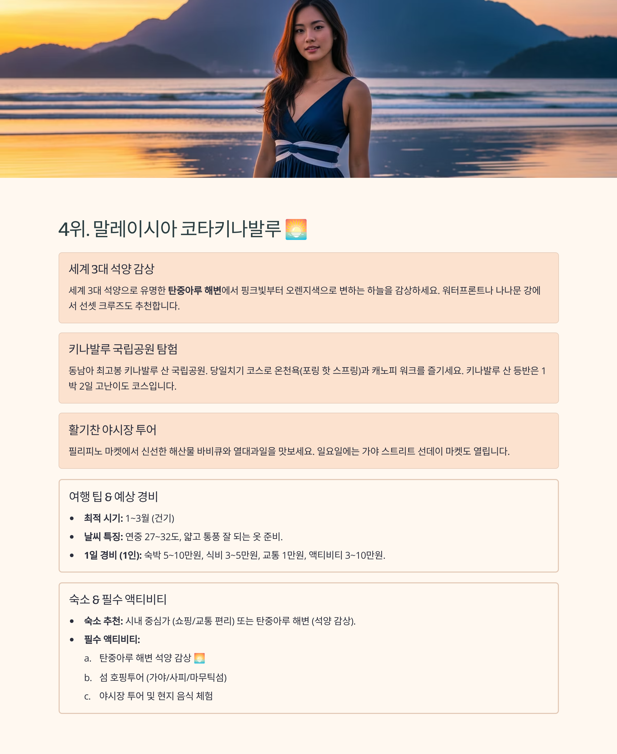 - 물가 : 식·교통 저렴, 투어 가성비 우수.