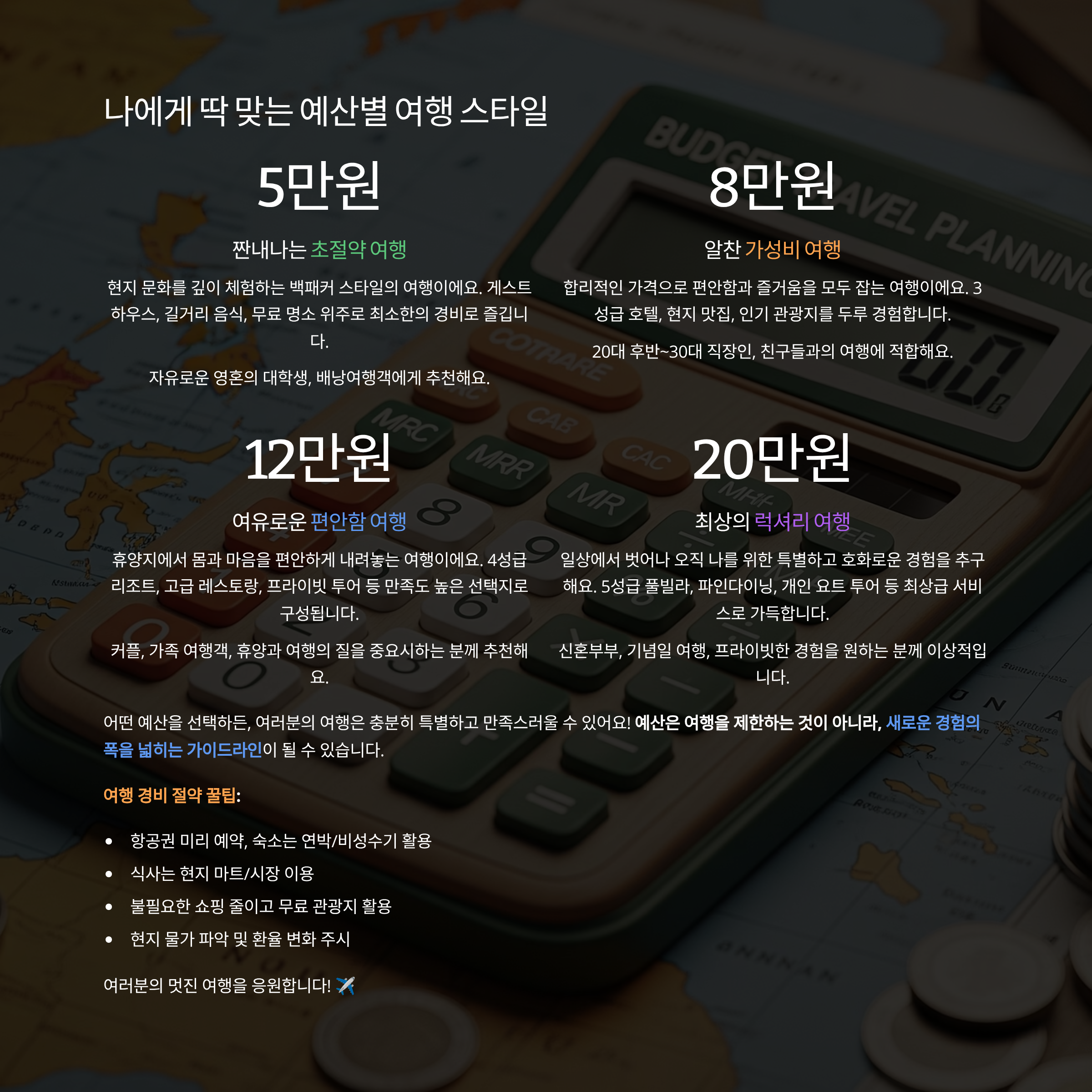 - 대략 예산 : 1인 하루 6만~12만원(식·교통·간단 액티비티)