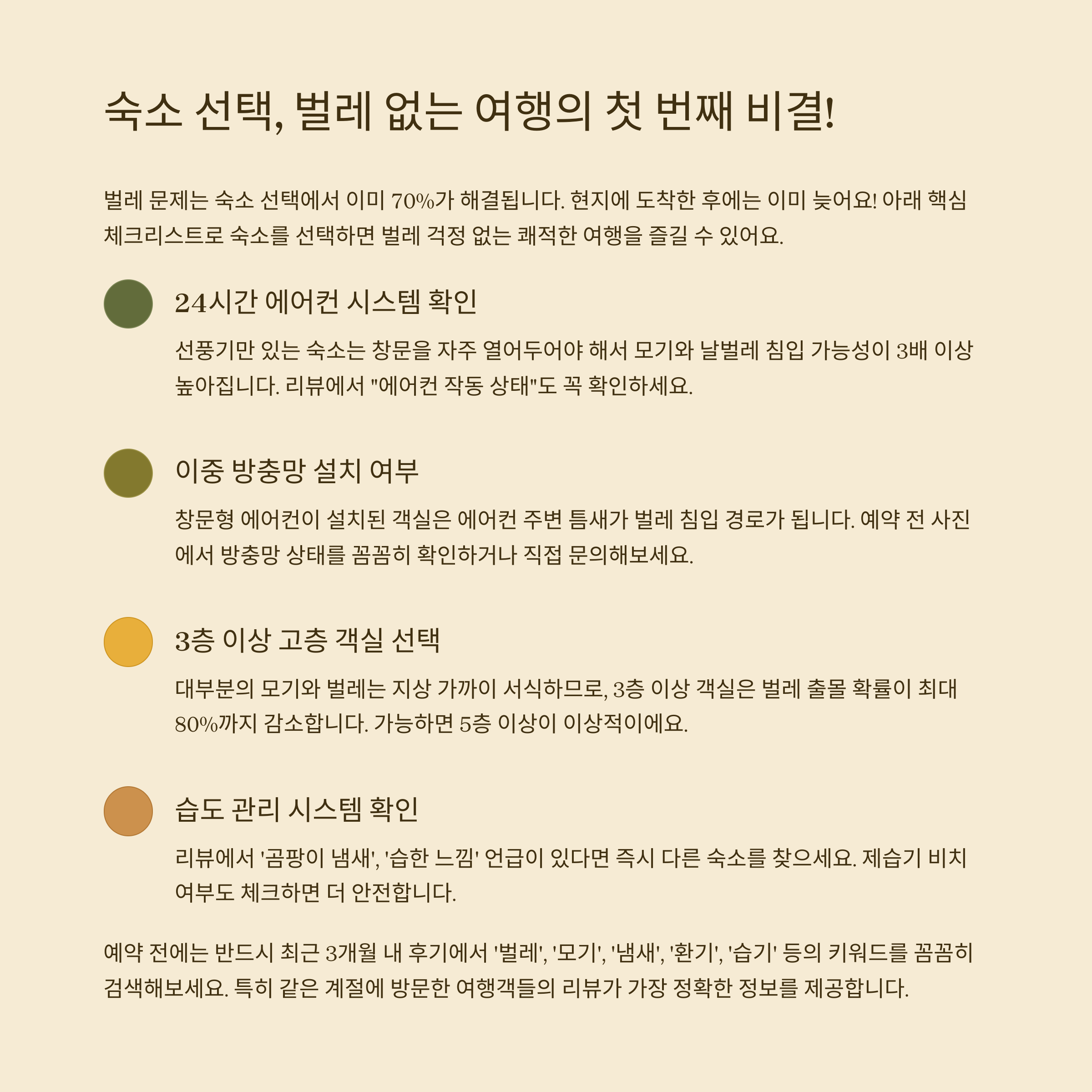 다음 조건을 기준으로 숙소를 고르면 벌레 걱정을 크게 줄일 수 있어요.