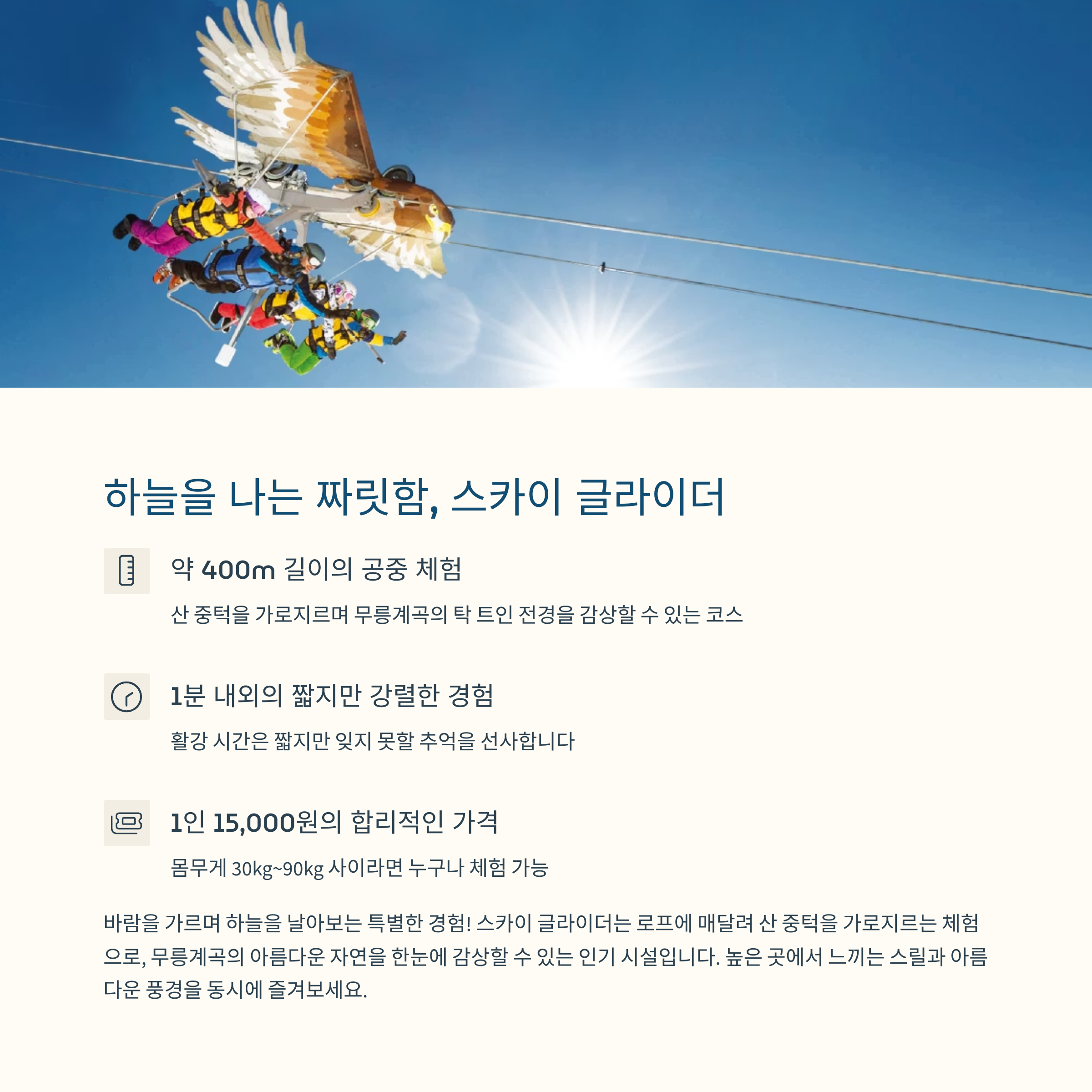 산과 하늘, 놀이와 자연이 어우러진 복합 체험형 관광지예요.