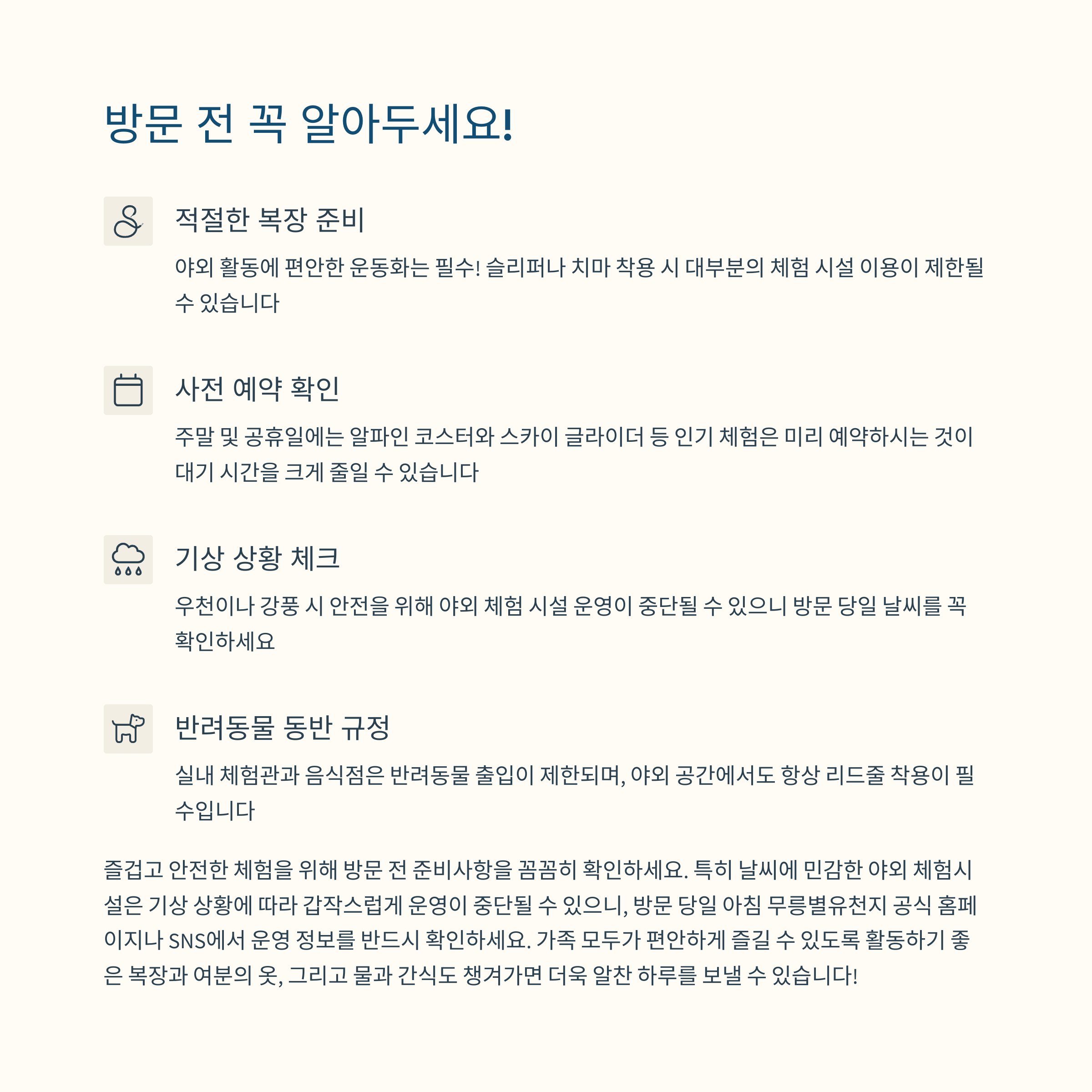 | 기상 상황 | 우천·강풍 시 일부 시설 운영 제한 가능 |