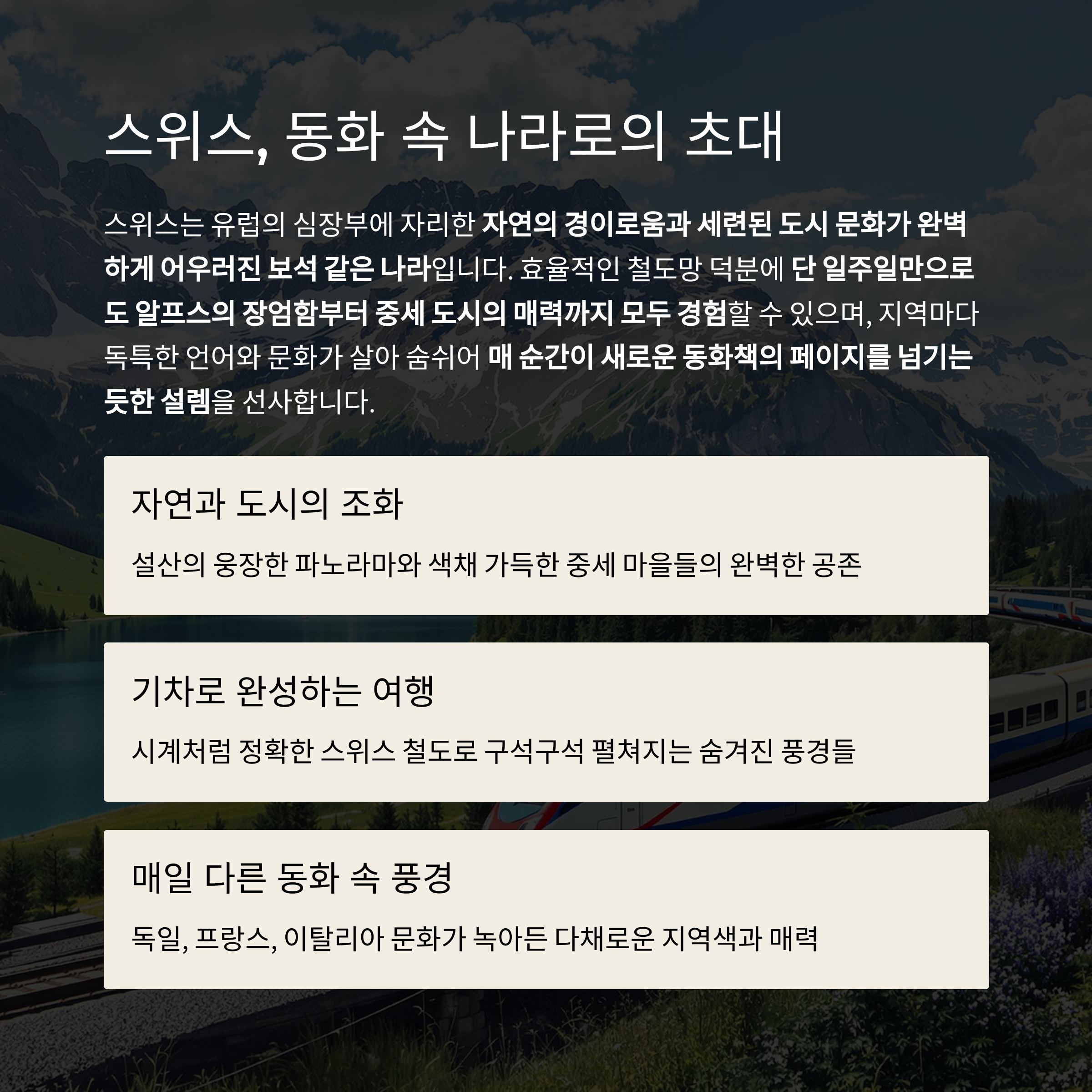 이번 글에서는 제가 직접 다녀온 7일간의 스위스 여행 코스와 감성 포인트를 정리했습니다.