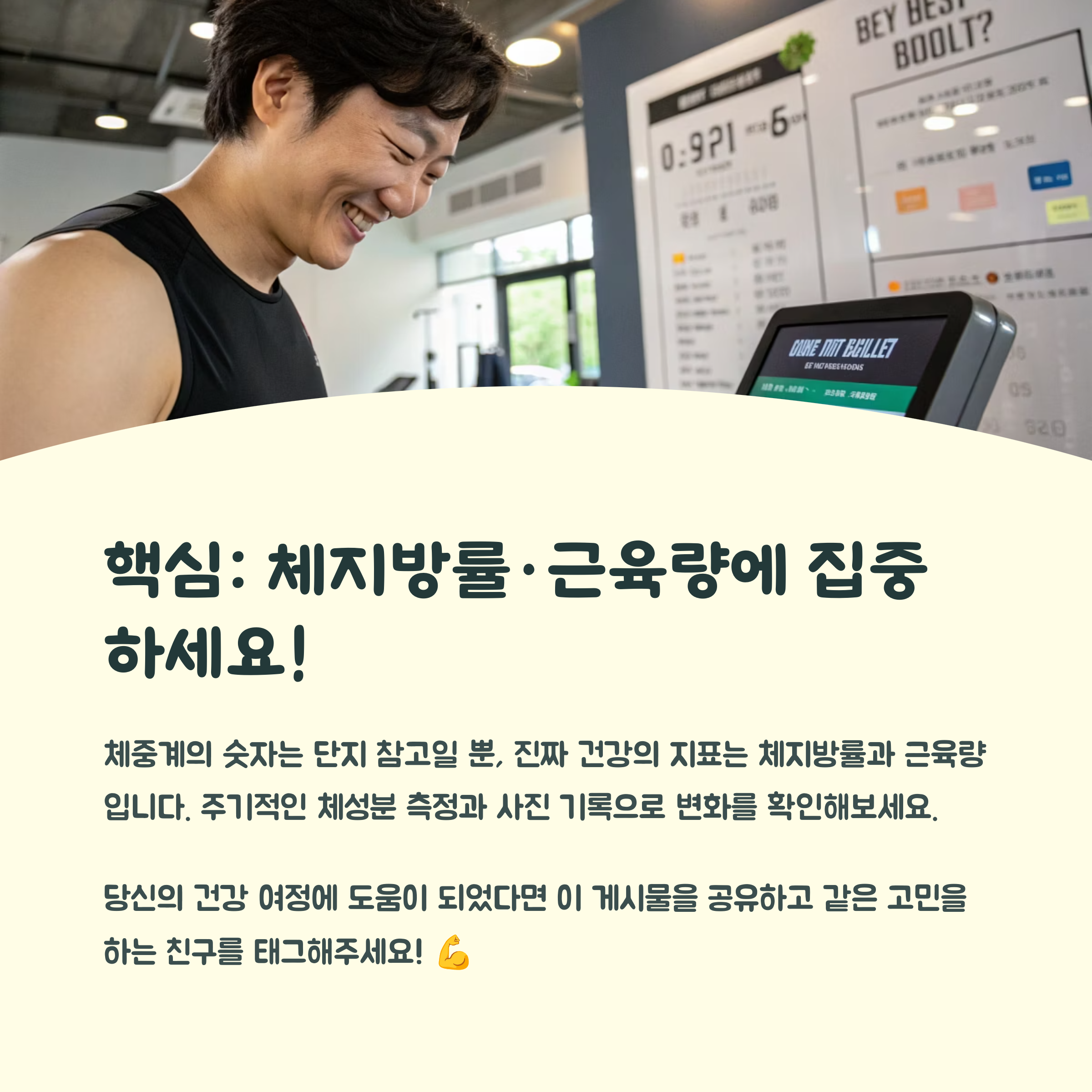 체중은 단순한 숫자에 불과합니다. 진짜 중요한 건 건강한 체지방률과 근육 비율, 그리고 에너지 넘치는 일상입니다. 매일의 변화는 숫자보다 거울, 사진, 옷핏을 통해 확인해보세요. 수치에 휘둘리기보다, 자신에게 집중하며 꾸준히 실천하는 것이 가장 강력한 변화의 원동력입니다.