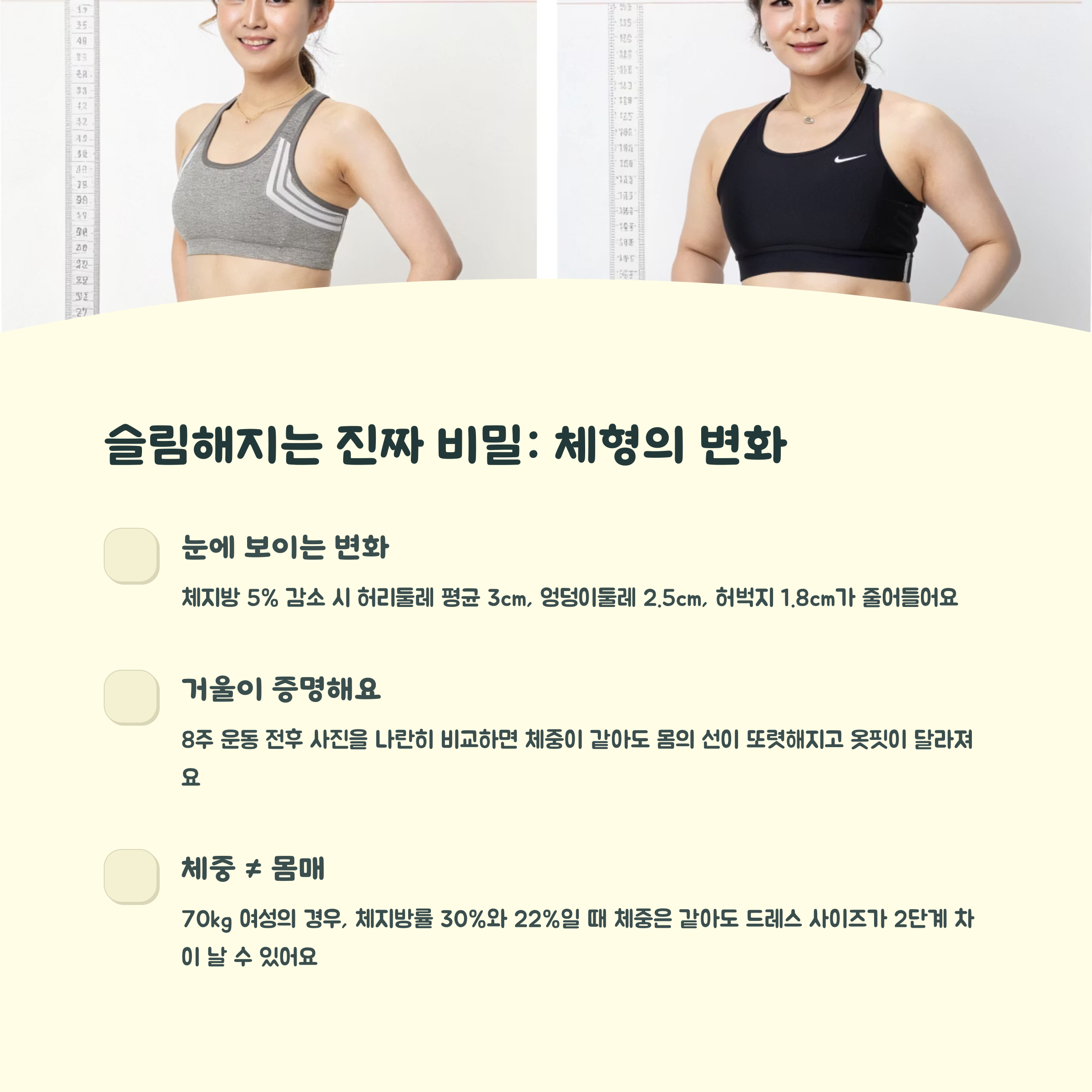 운동과 식단을 병행해야 정확히 관리 가능 | 체중보다 체형과 컨디션 변화로 확인 | 변화는 체중계보다 거울 속 모습으로 판단 |