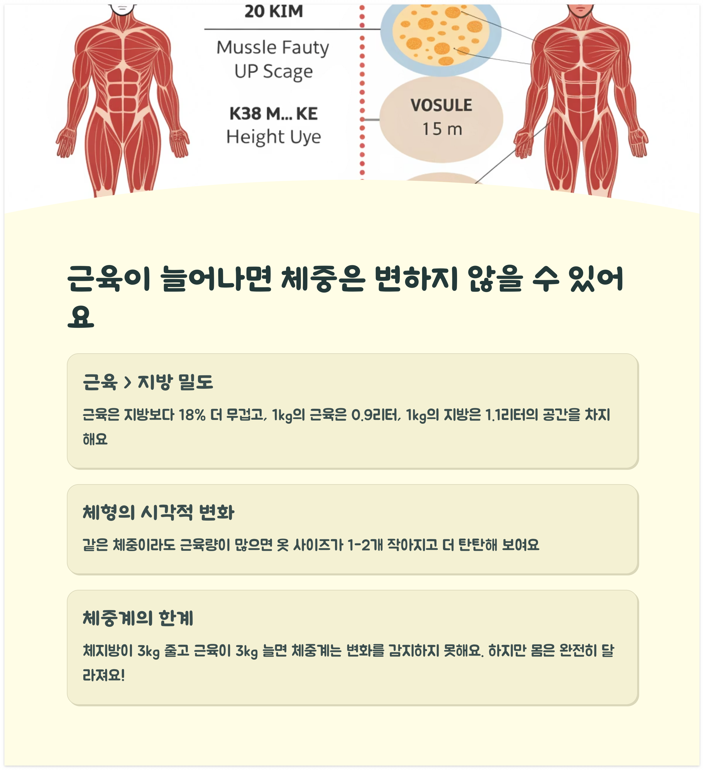 체지방률이 낮아졌음에도 불구하고 체중이 줄지 않는 경우는 의외로 많은 사람들이 겪는 일입니다. 이런 현상은 다이어트 실패가 아닌, 오히려 근육량 증가에 따른 건강한 변화일 수 있습니다. 지방은 부피가 크고 가볍지만, 근육은 부피가 작고 무겁기 때문에 동일한 무게라도 체형은 더 슬림하고 탄탄해질 수 있습니다. 이런 경우 체중계 숫자보다 체지방률, 근육량, 체형 변화가 더 중요한 지표가 됩니다.