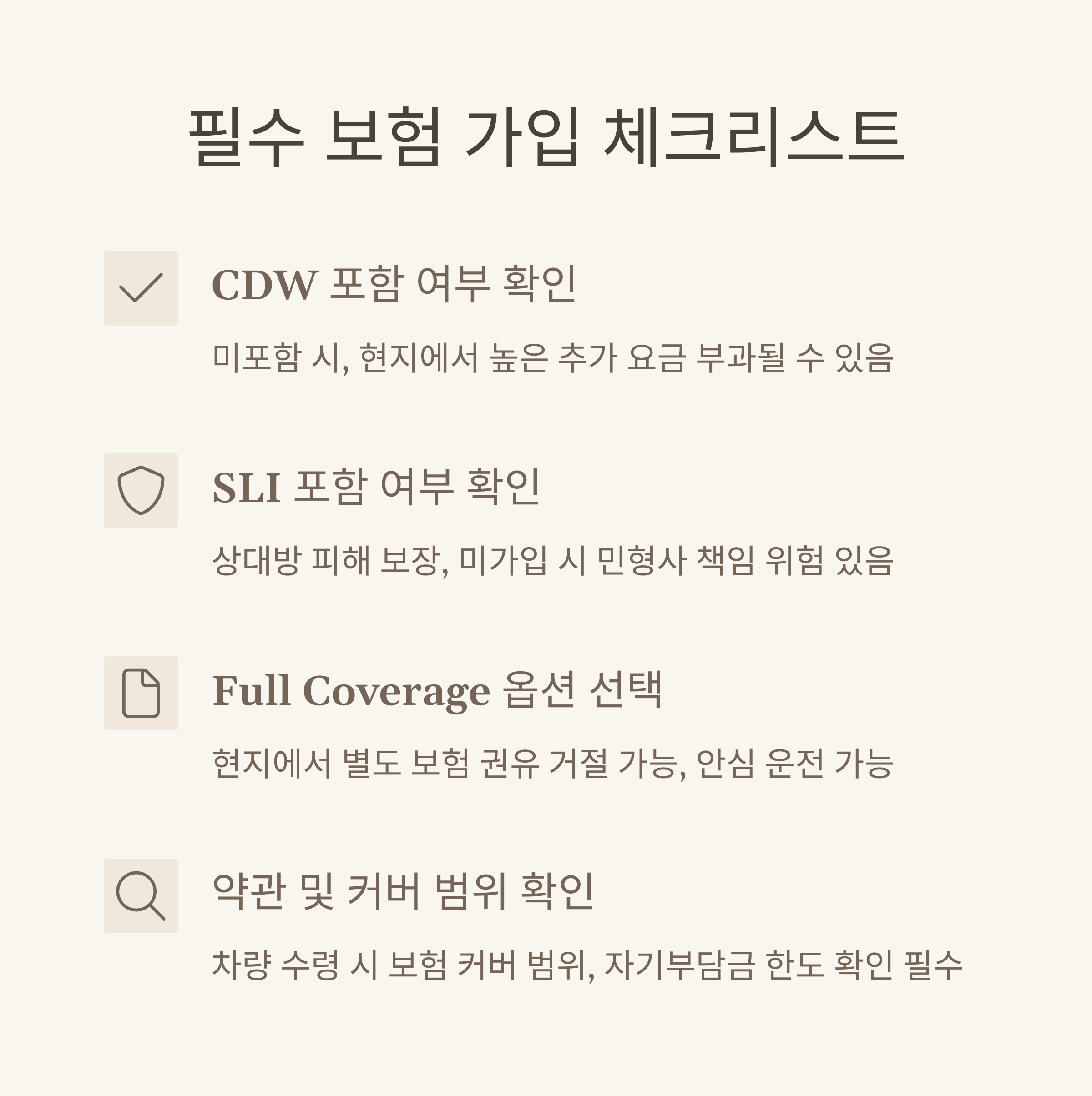- CDW 포함 여부 확인 (미포함 시, 현지에서 높은 추가 요금 부과)
