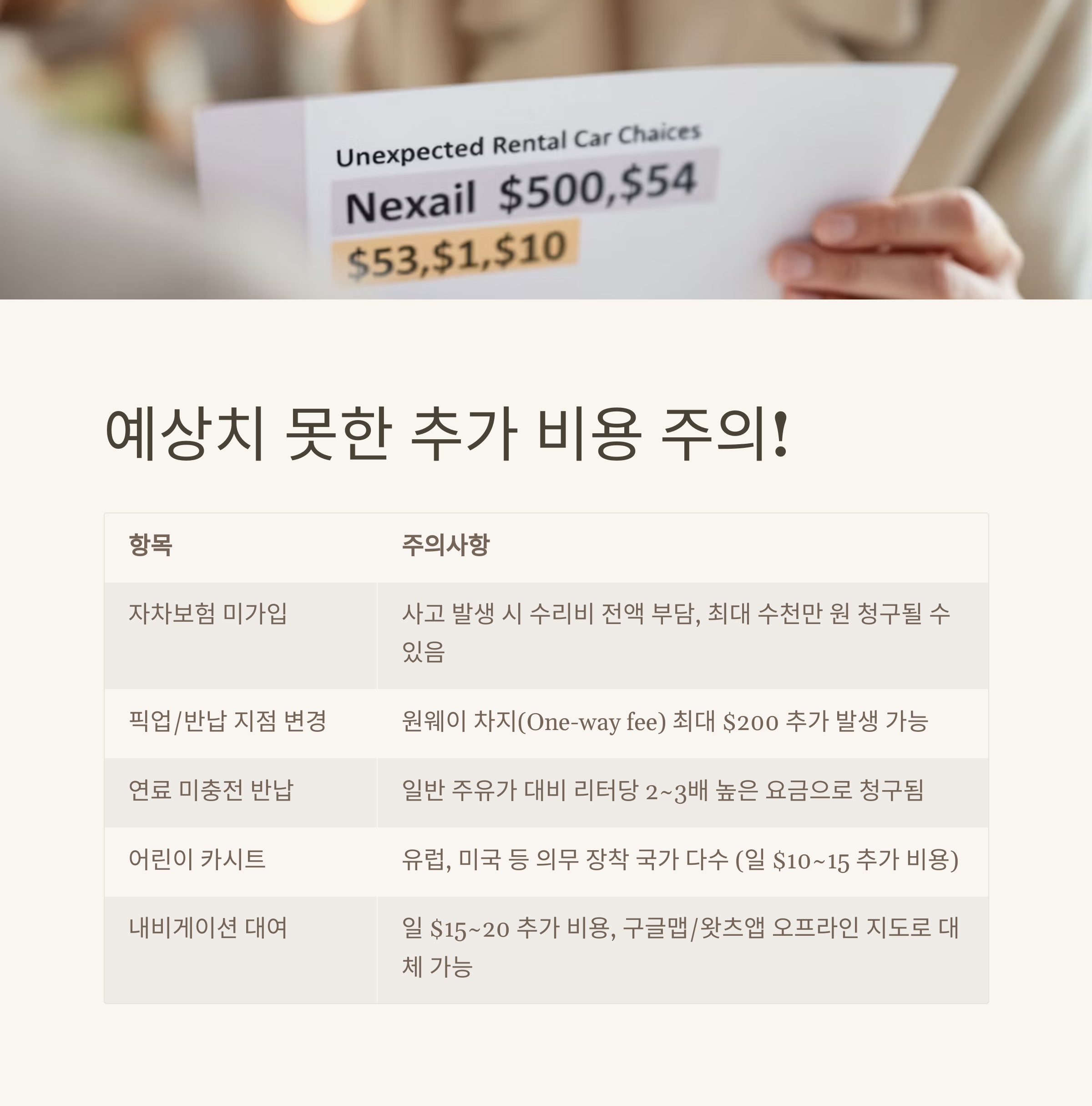 특히 보험 조건 미확인, 연료 정책 오해, 숨겨진 수수료 등으로 인해 불편을 겪는 사례가 빈번합니다.
