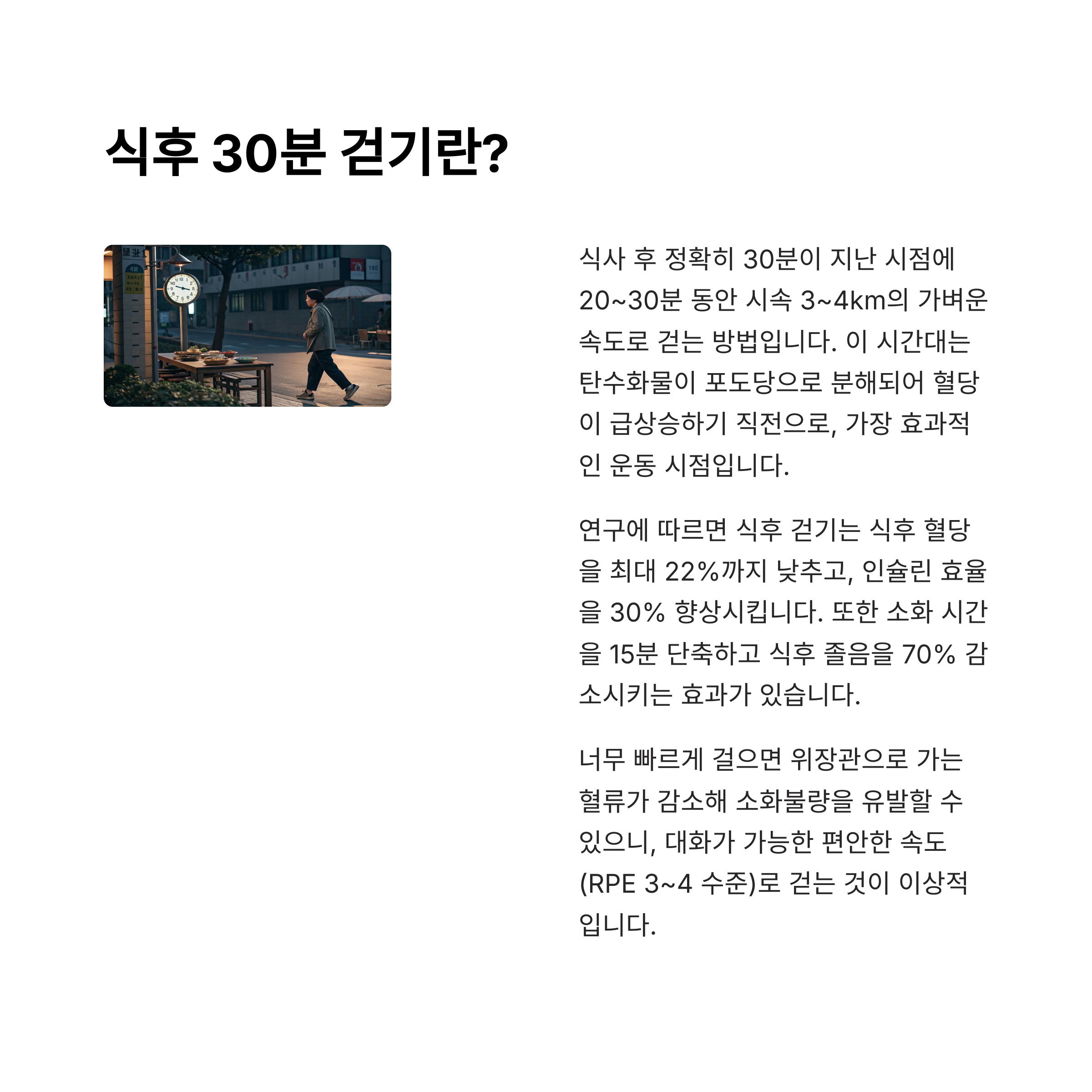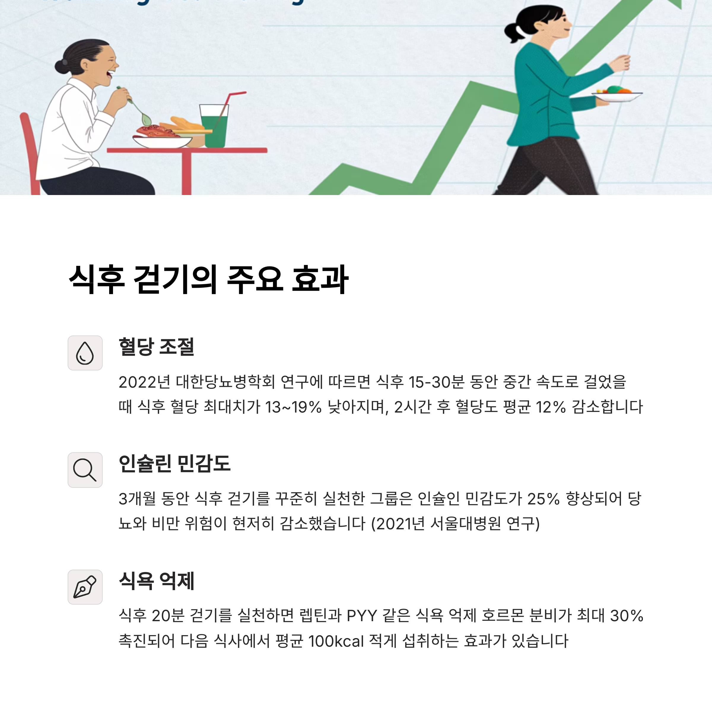 - ✔ 식후 걷기: 식사 후 15분 이내 가볍게 시작, 30분까지 점진적 증가