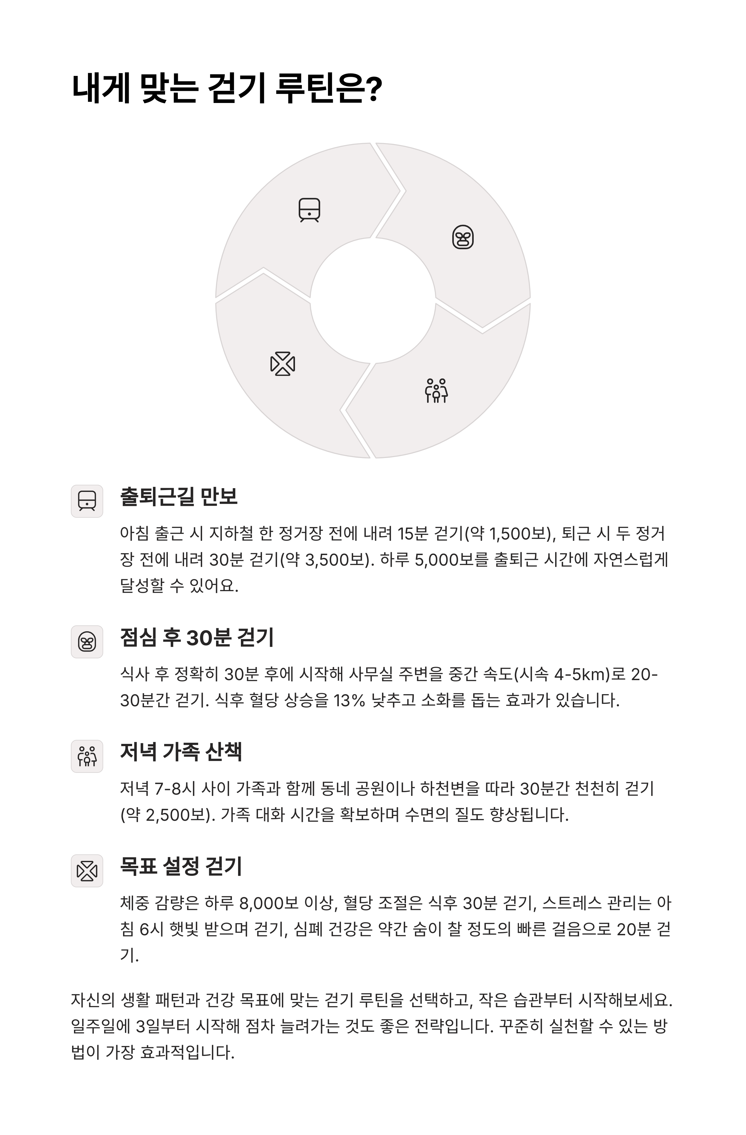 | 추천 대상 | 걷기를 시작하려는 초보자, 혈당·체중관리 중인 직장인, 루틴형 운동을 찾는 독자 |