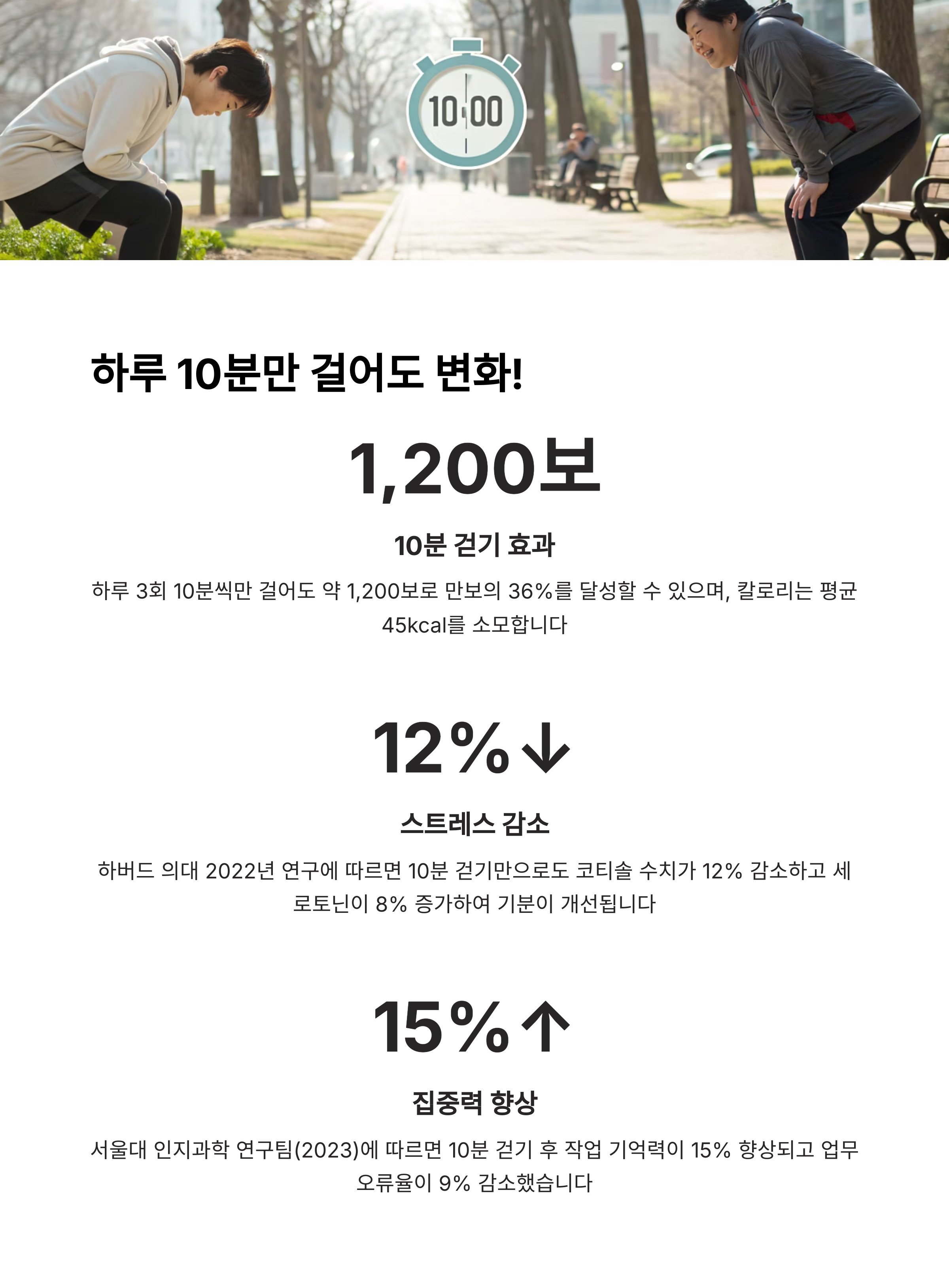 | 콘텐츠 목적 | 만보 걷기 vs 식후 걷기의 효과를 비교해 맞춤 루틴 설계 |