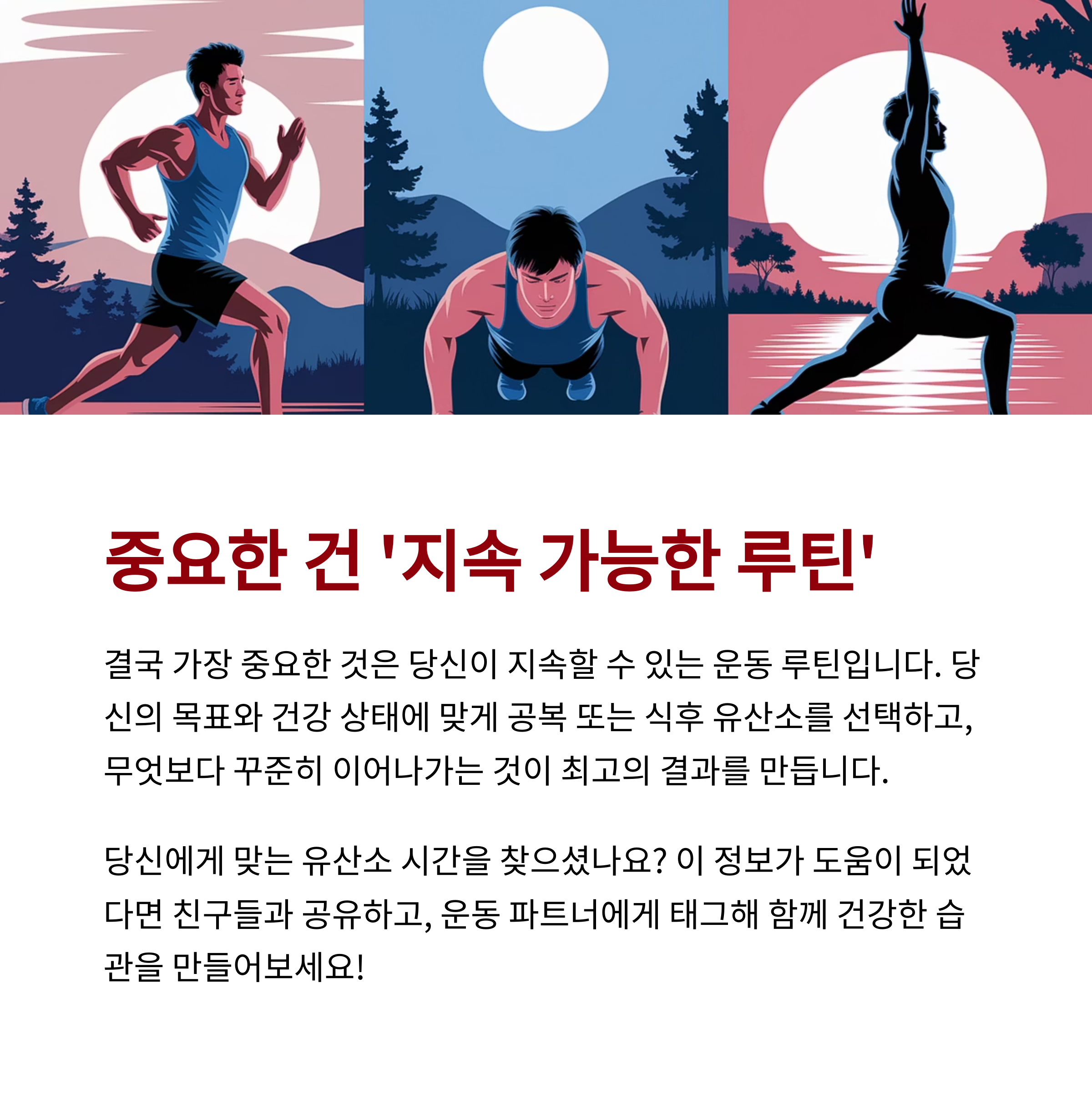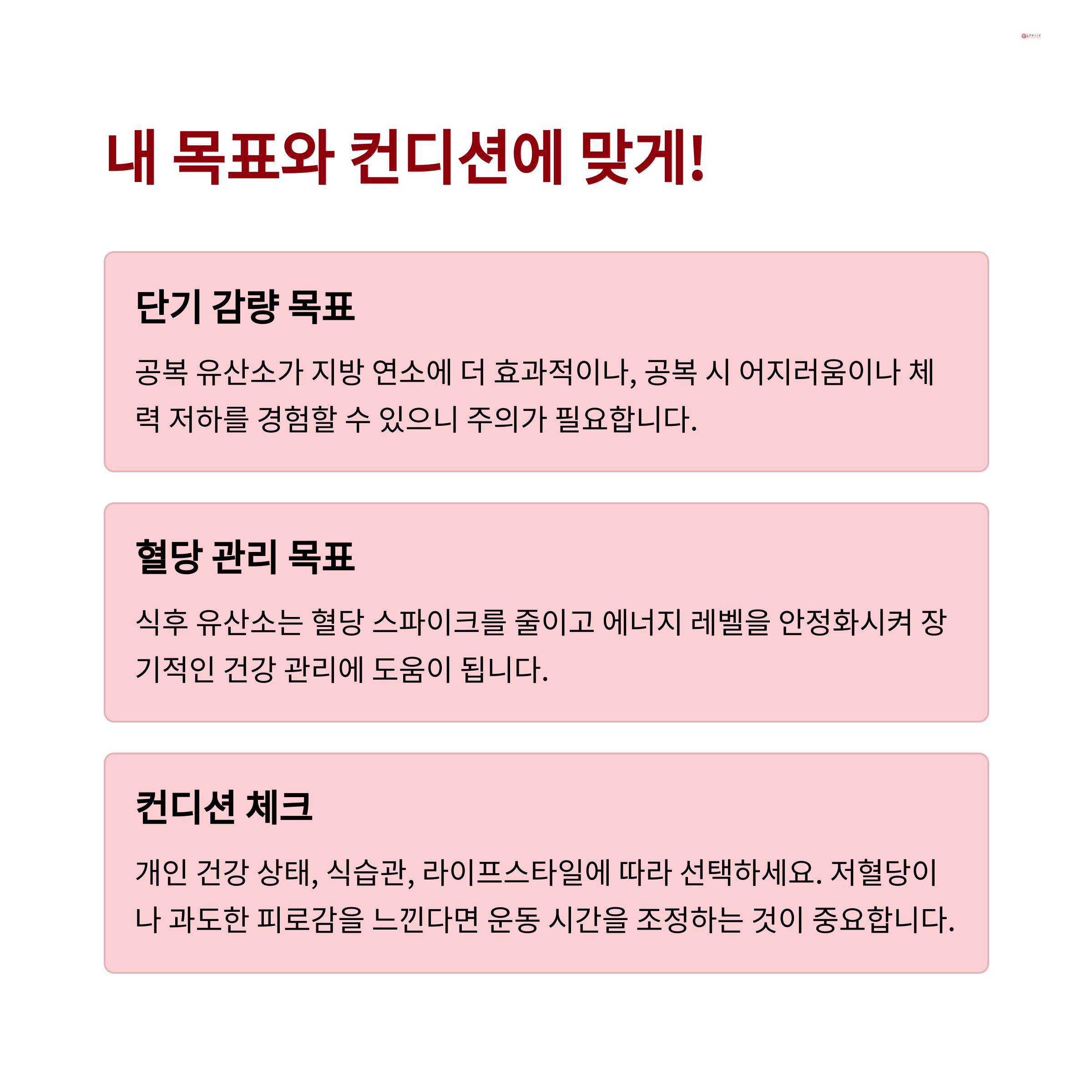 | 공복 저혈당 주의 필요 | 과식 후 운동은 피해야 효과적 | 지속 가능한 루틴이 가장 중요함 |