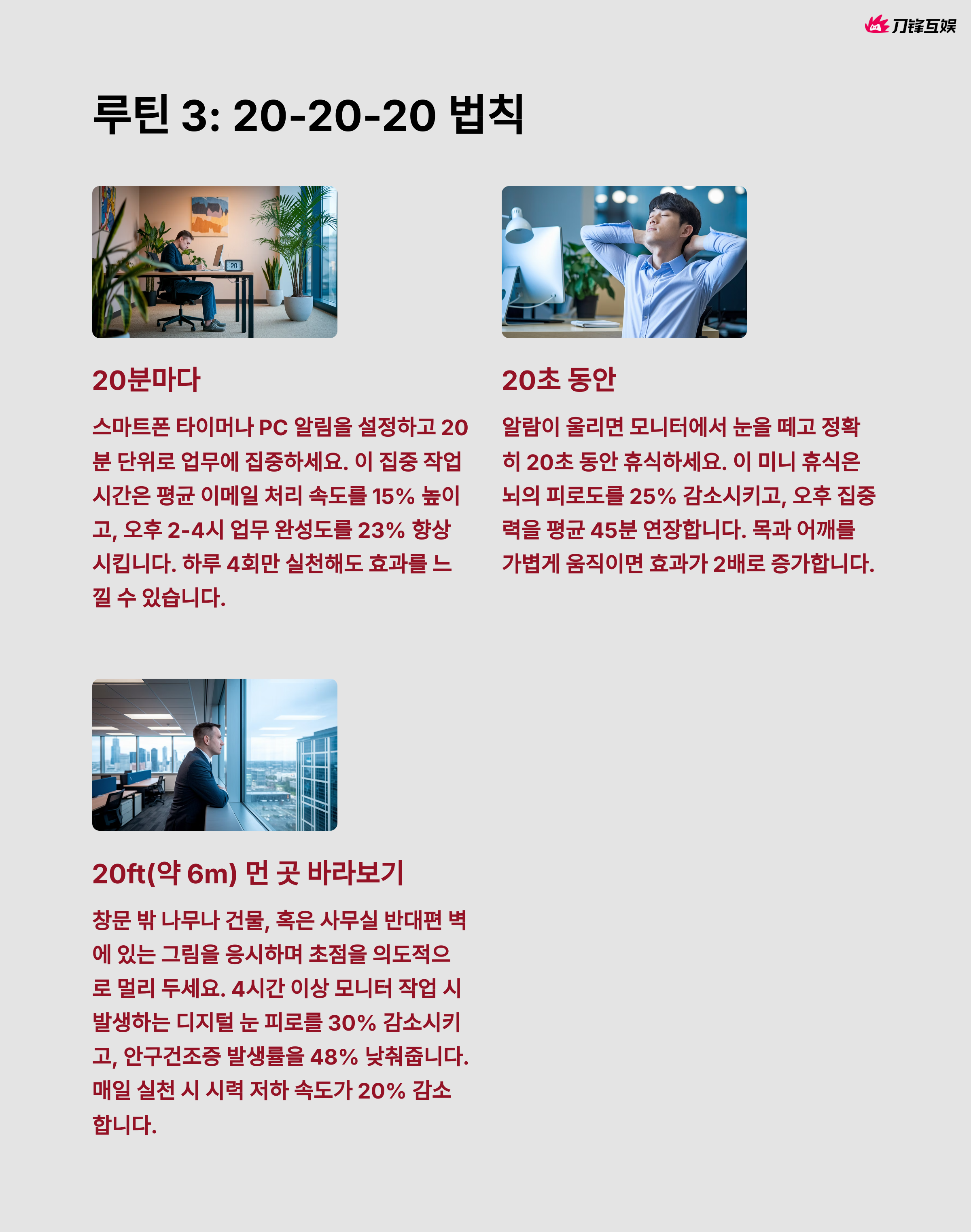 20분마다 20피트(6m) 거리의 사물을 20초간 응시하기. 디지털 피로 예방 + 두통 방지에 탁월해요.