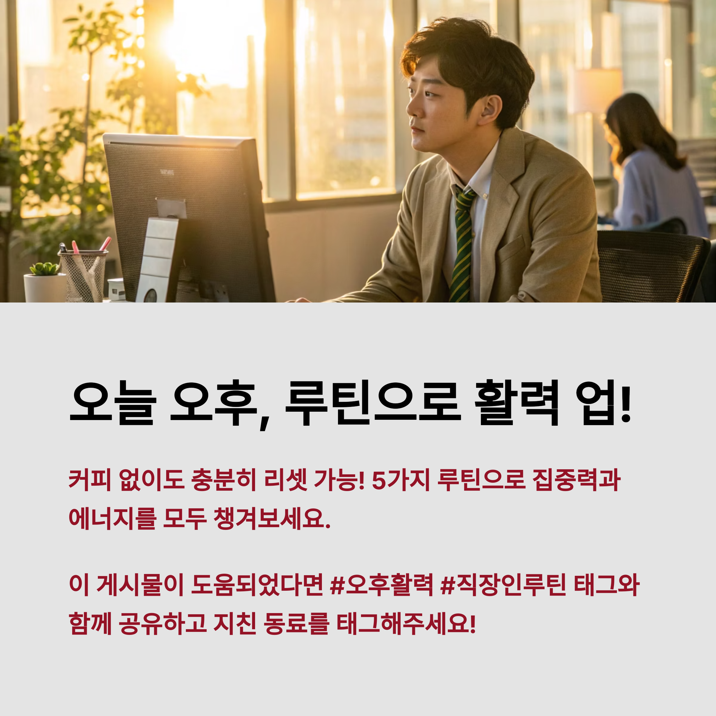 주요 키워드 오후피로, 직장인루틴, 눈피로회복, 스트레칭, 카페인대체, 업무집중력