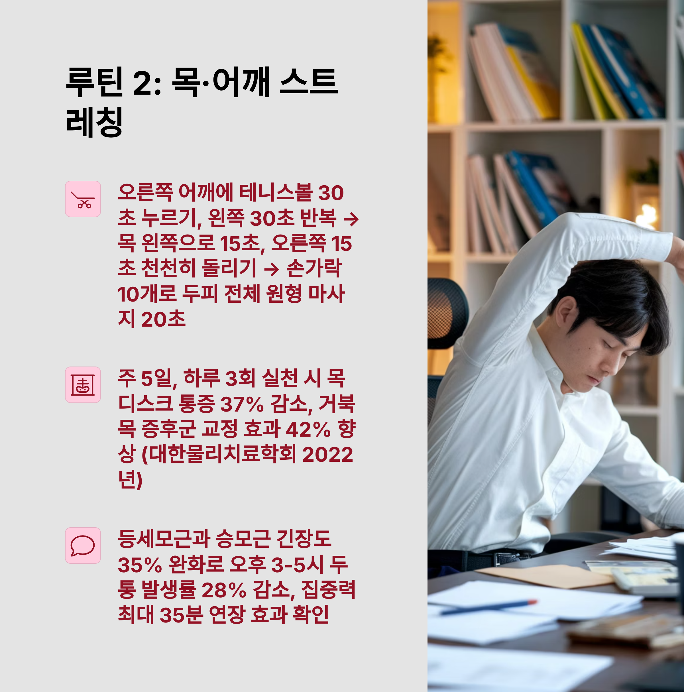 스마트폰을 내려두고, 목을 천천히 앞·뒤·좌우로 돌려주세요. 어깨를 5회씩 위아래 반복하면 근막 이완 + 산소 공급 효과.