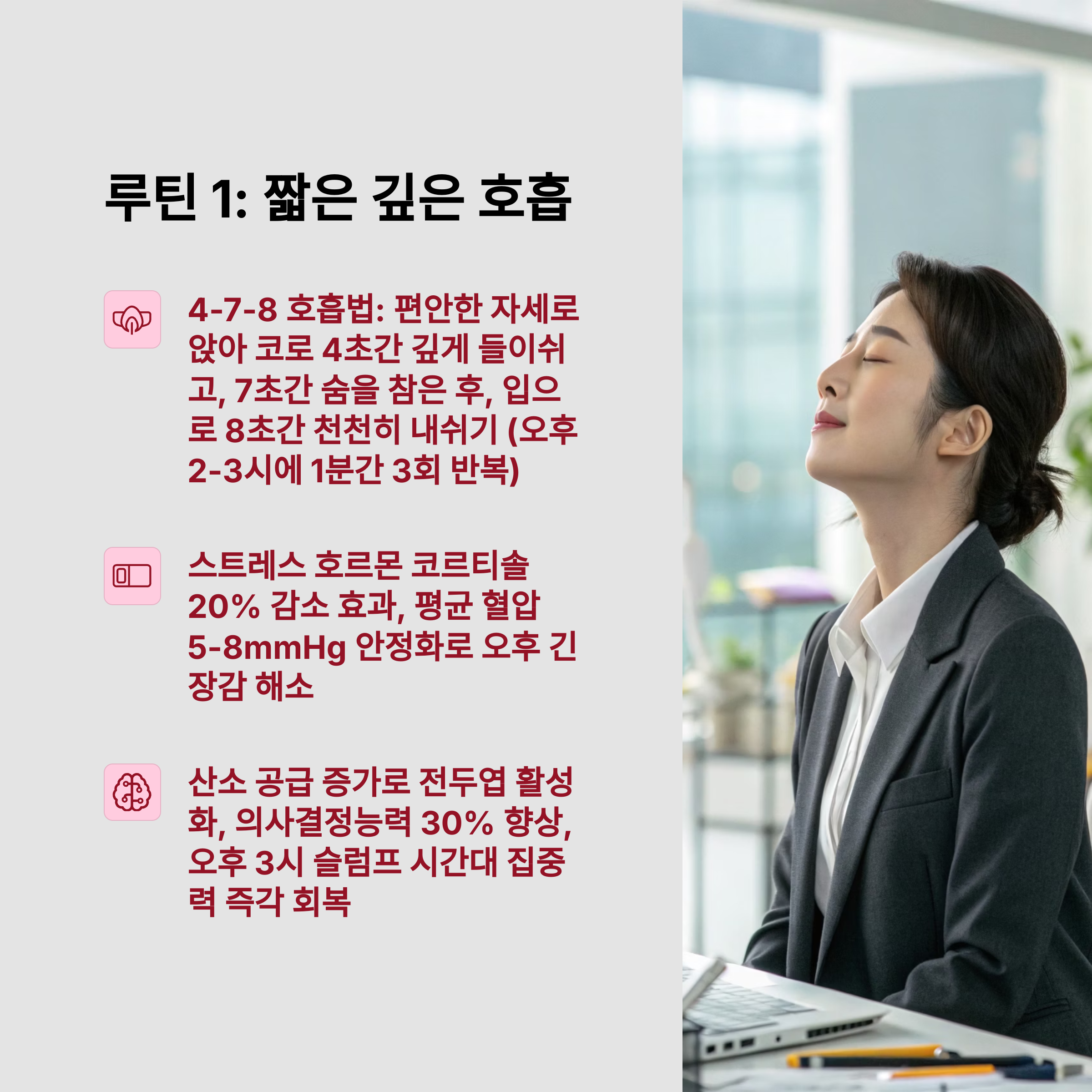 눈을 감고 천천히 4초 들이마시고, 6초 내쉬는 호흡을 3번 반복해보세요. 심박수 안정 + 집중력 회복 효과가 있습니다.