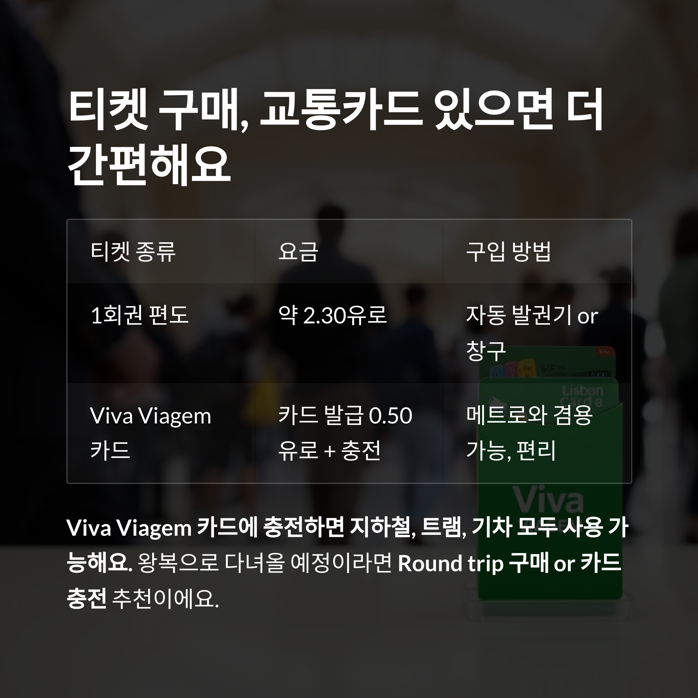 | Viva Viagem 카드 | 카드 발급 0.50유로 + 충전 | 메트로와 겸용 가능, 편리 |