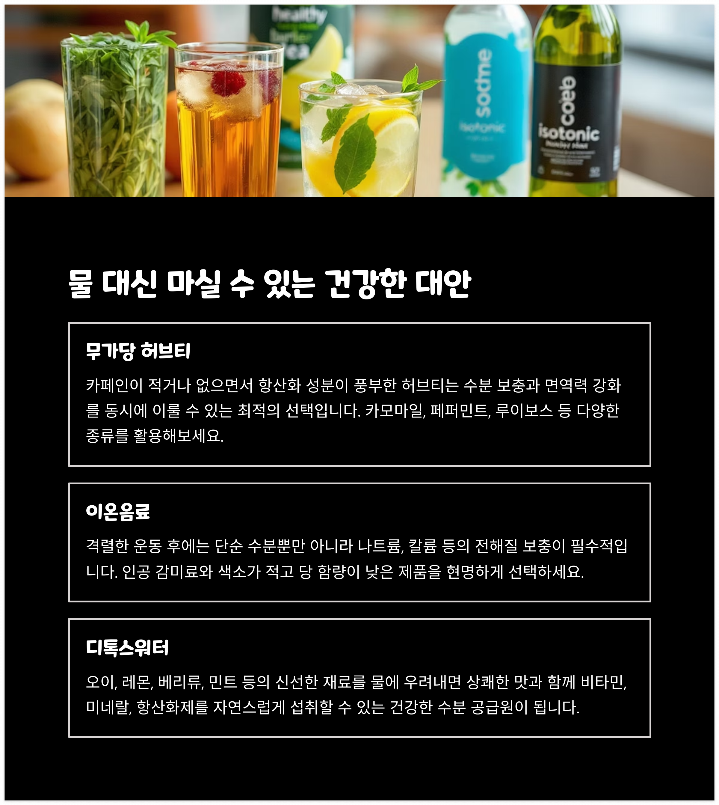 중요한 것은 '총 수분 섭취량'을 충분히 맞추는 것입니다.