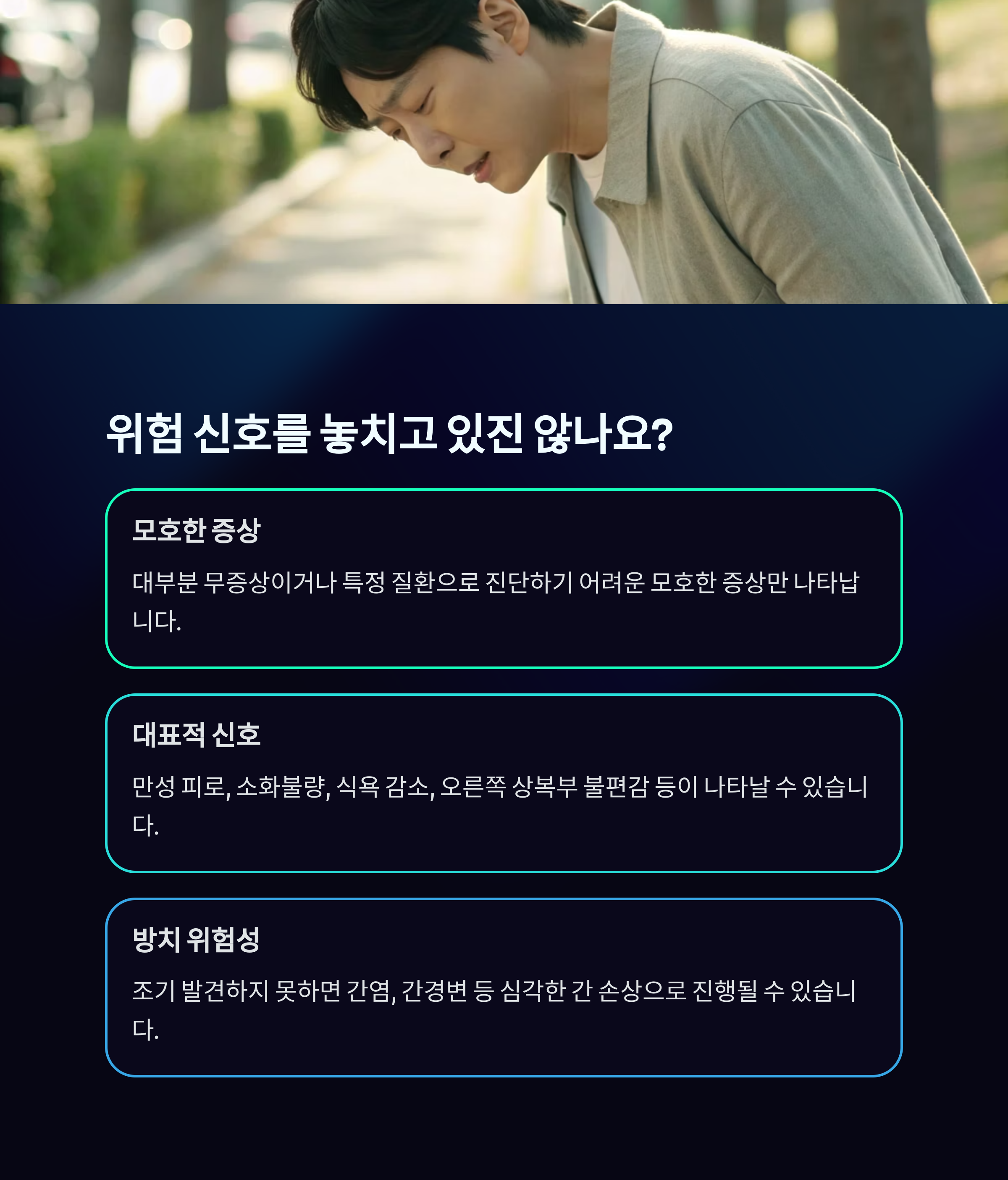 방치하면 간염, 간경변, 간암으로 진행될 수 있습니다.