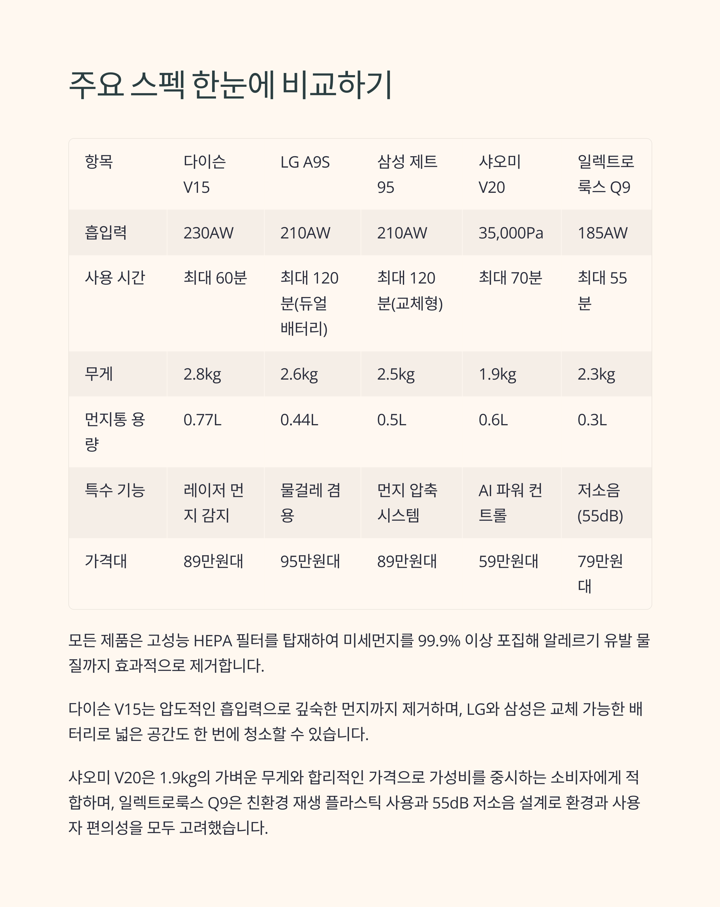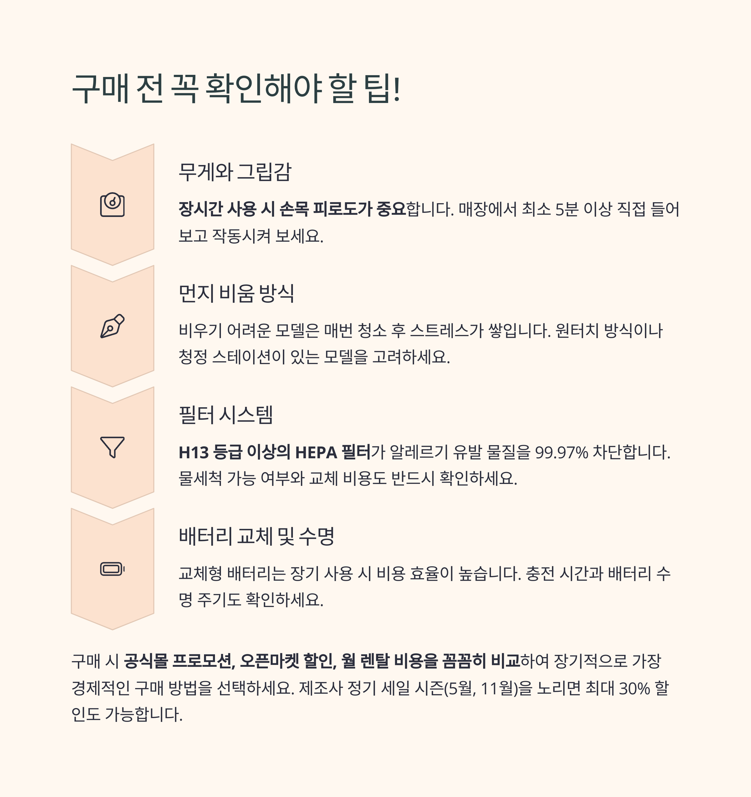 흡입력, 사용 시간, 무게, 가격, AS 등을 객관적으로 정리합니다.