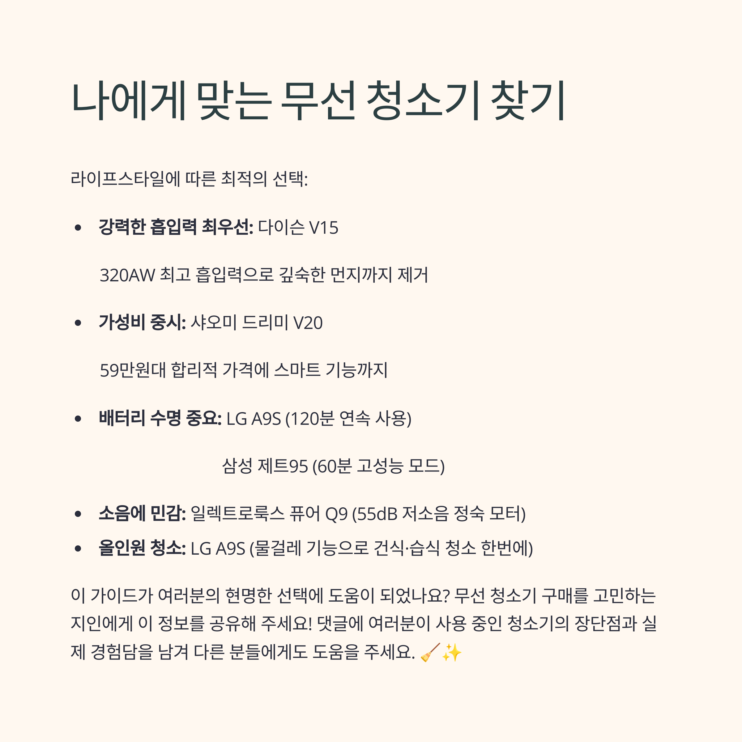 - 가성비+브랜드 밸런스 → 삼성 제트95 (흡입력+가격 균형)