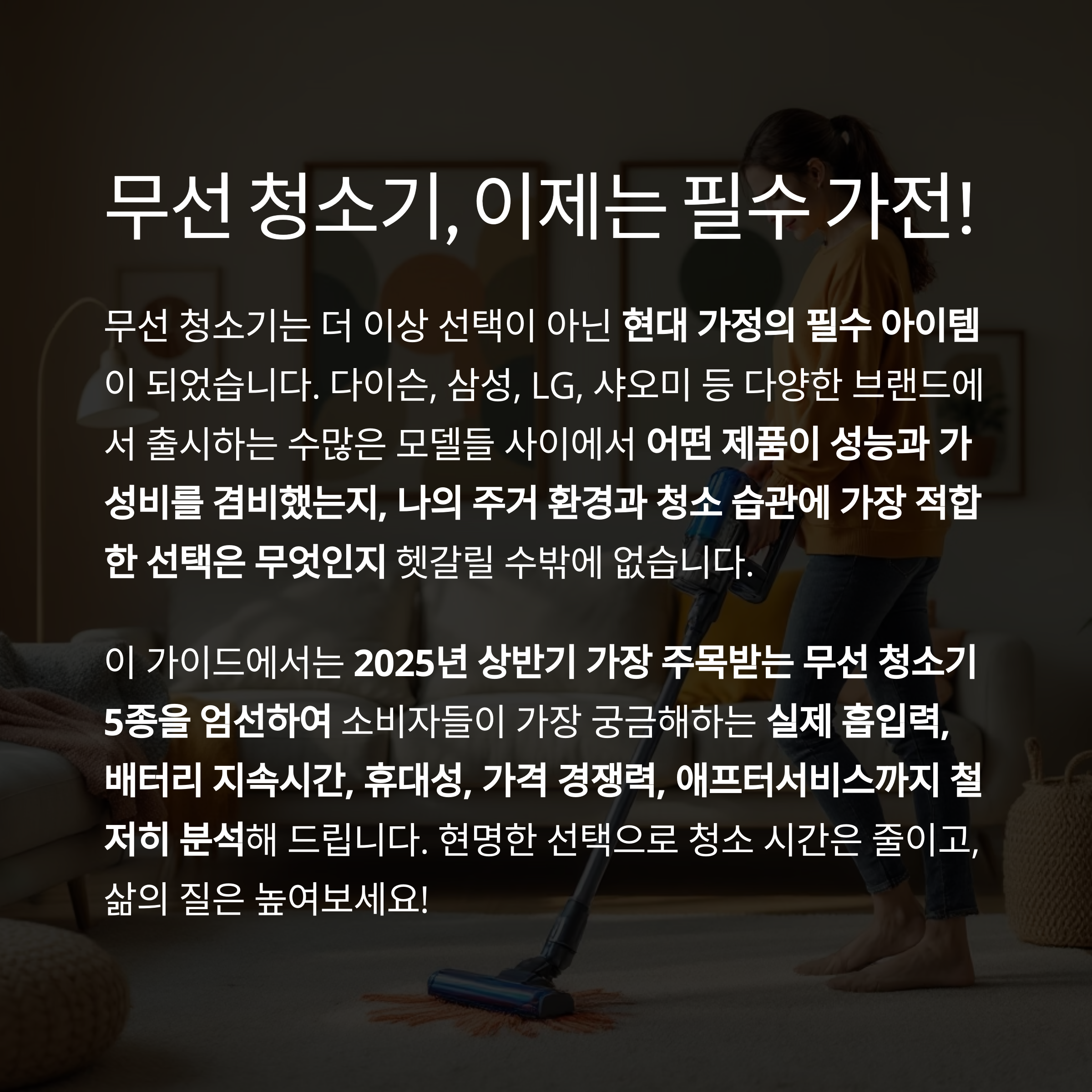 이번 글에서는 2025년 현재 기준 인기 무선 청소기 5종을 비교해