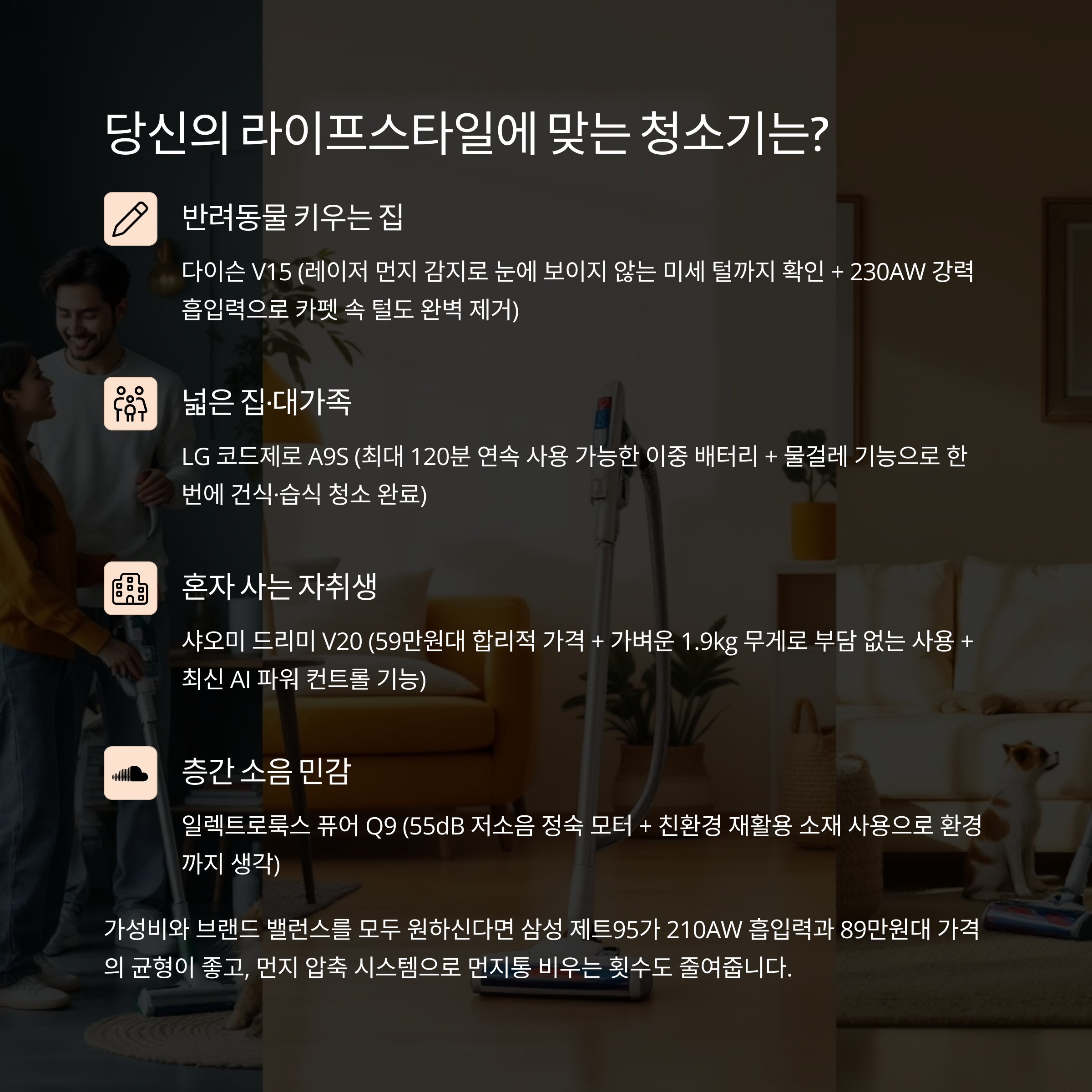 - 반려동물 키우는 집 → 다이슨 V15 (미세먼지 감지 + 강력 흡입)