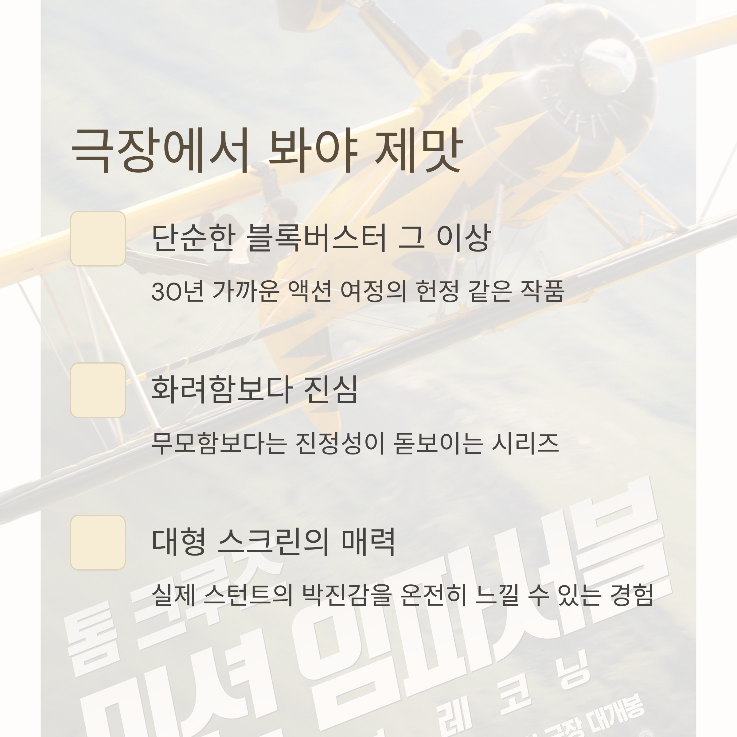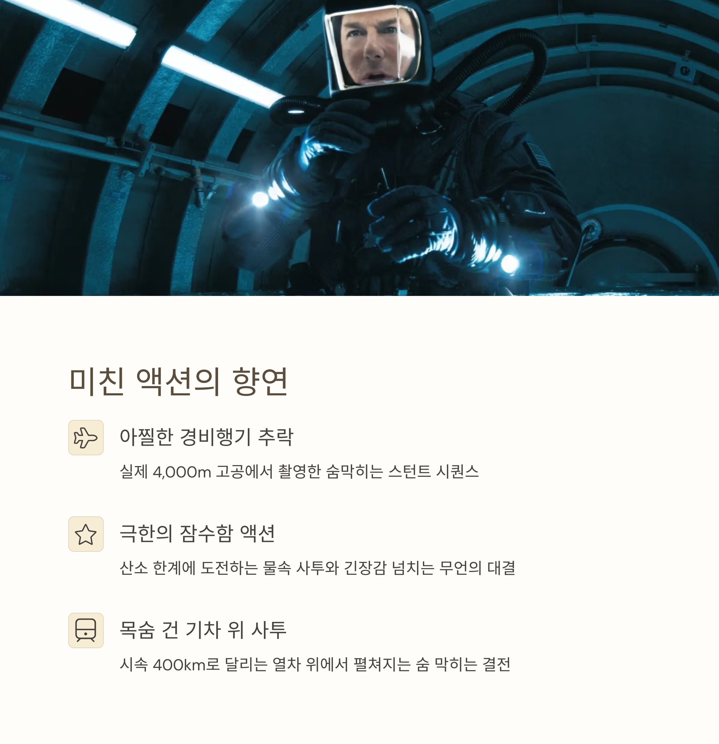 - 톰 크루즈의 실제 스턴트와 액션 시퀀스