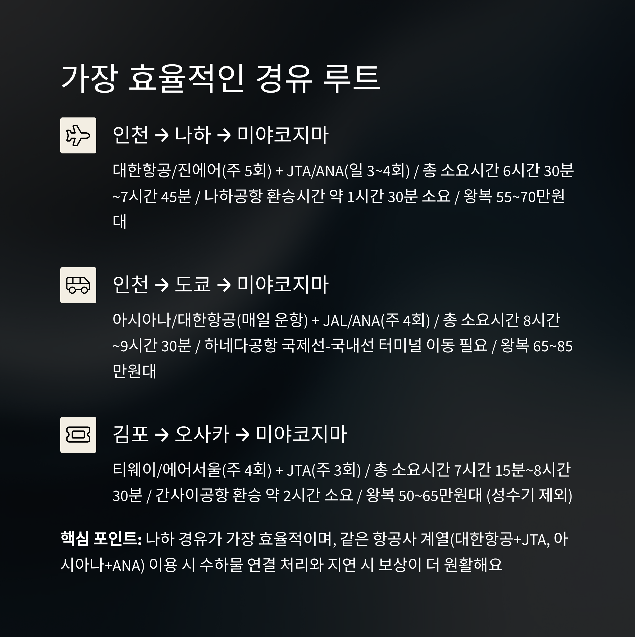 인천 → 나하 → 미야코지마 | 대한항공 또는 진에어 + JTA/ANA | 약 6~8시간 |
