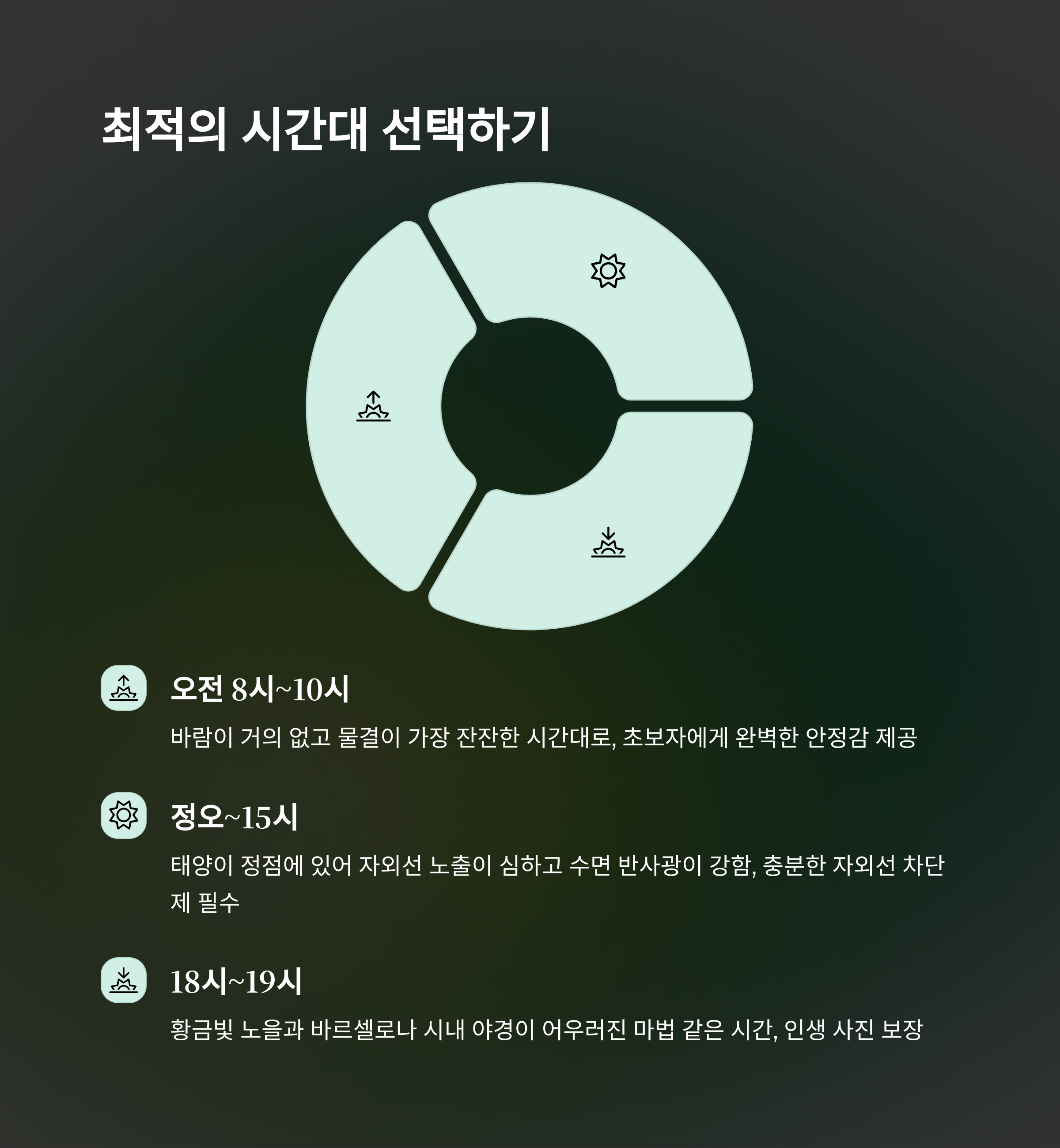 팁: 아침 타임이 초보자에게 가장 안전하고 쾌적해요.