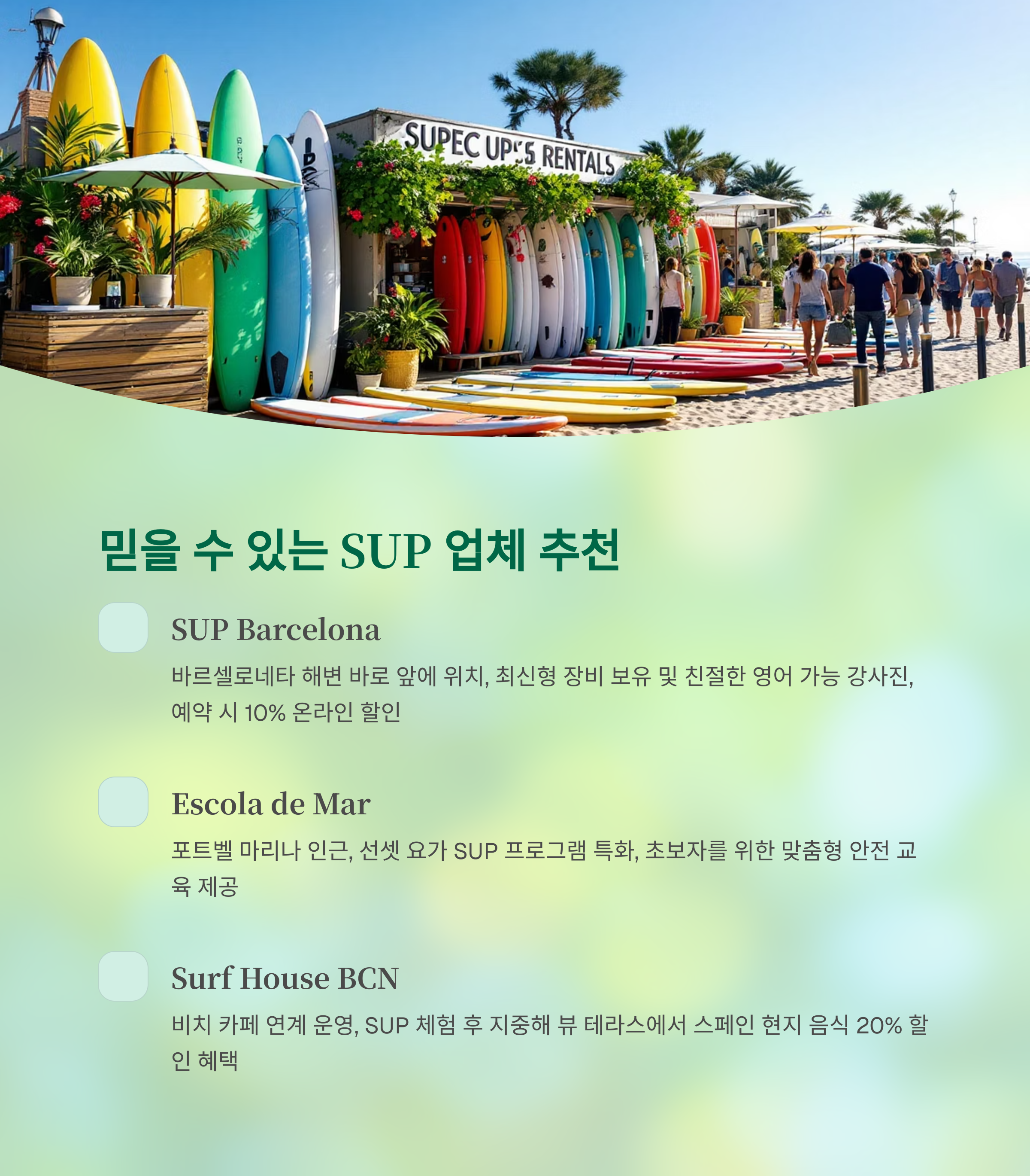 | SUP Barcelona | 바르셀로네타 해변 바로 앞 | 장비 상태 좋고 영어 가능 |