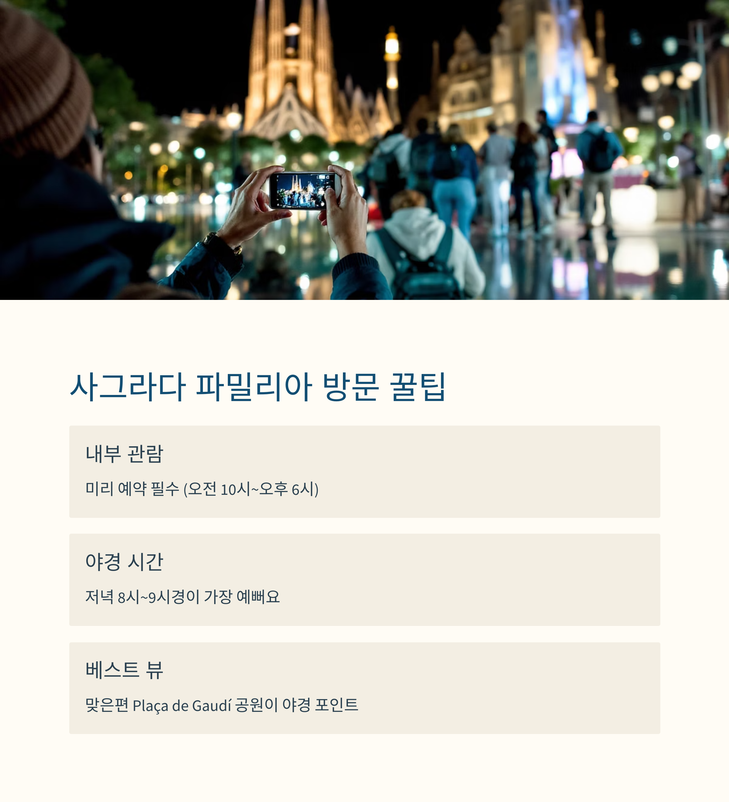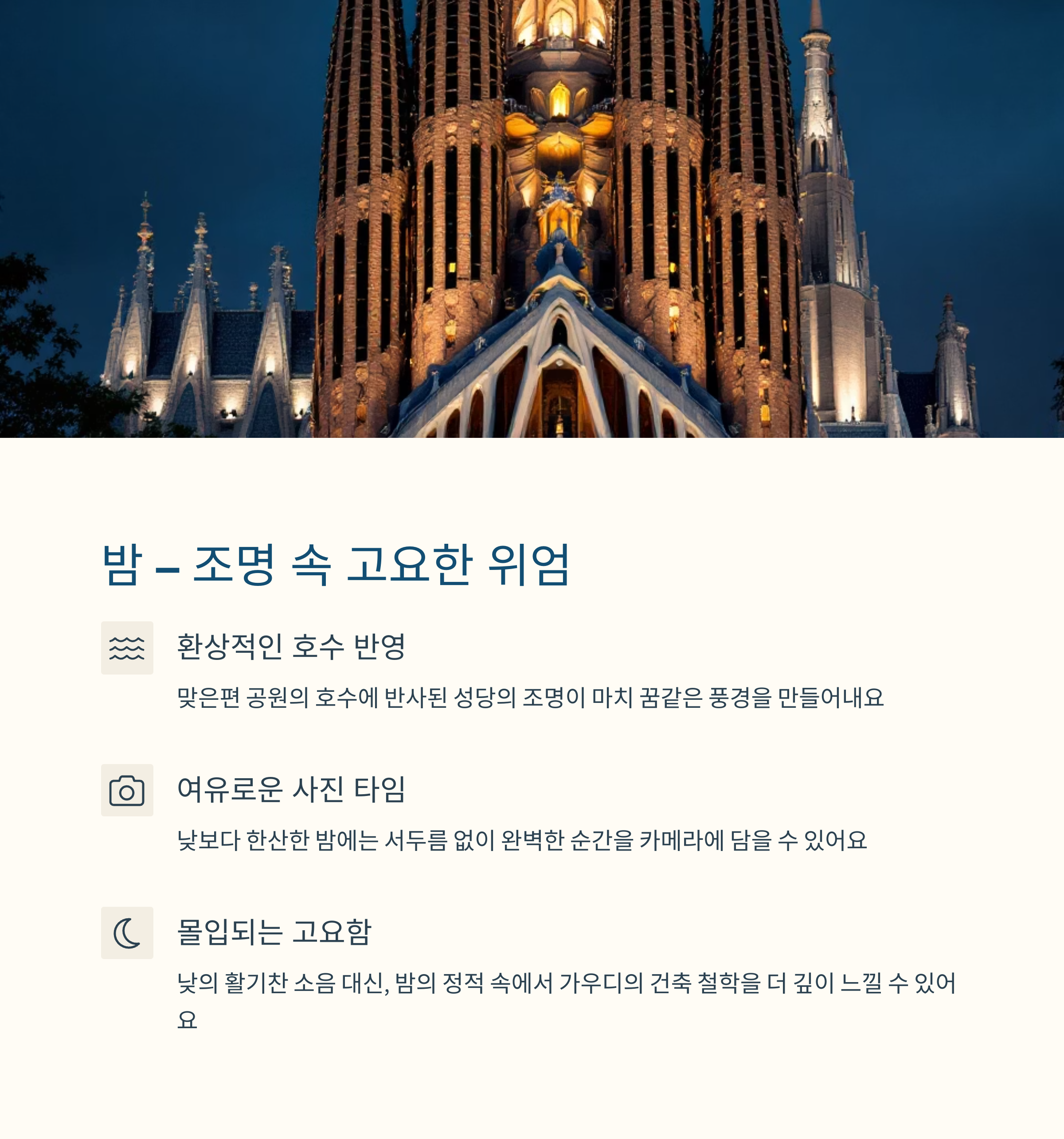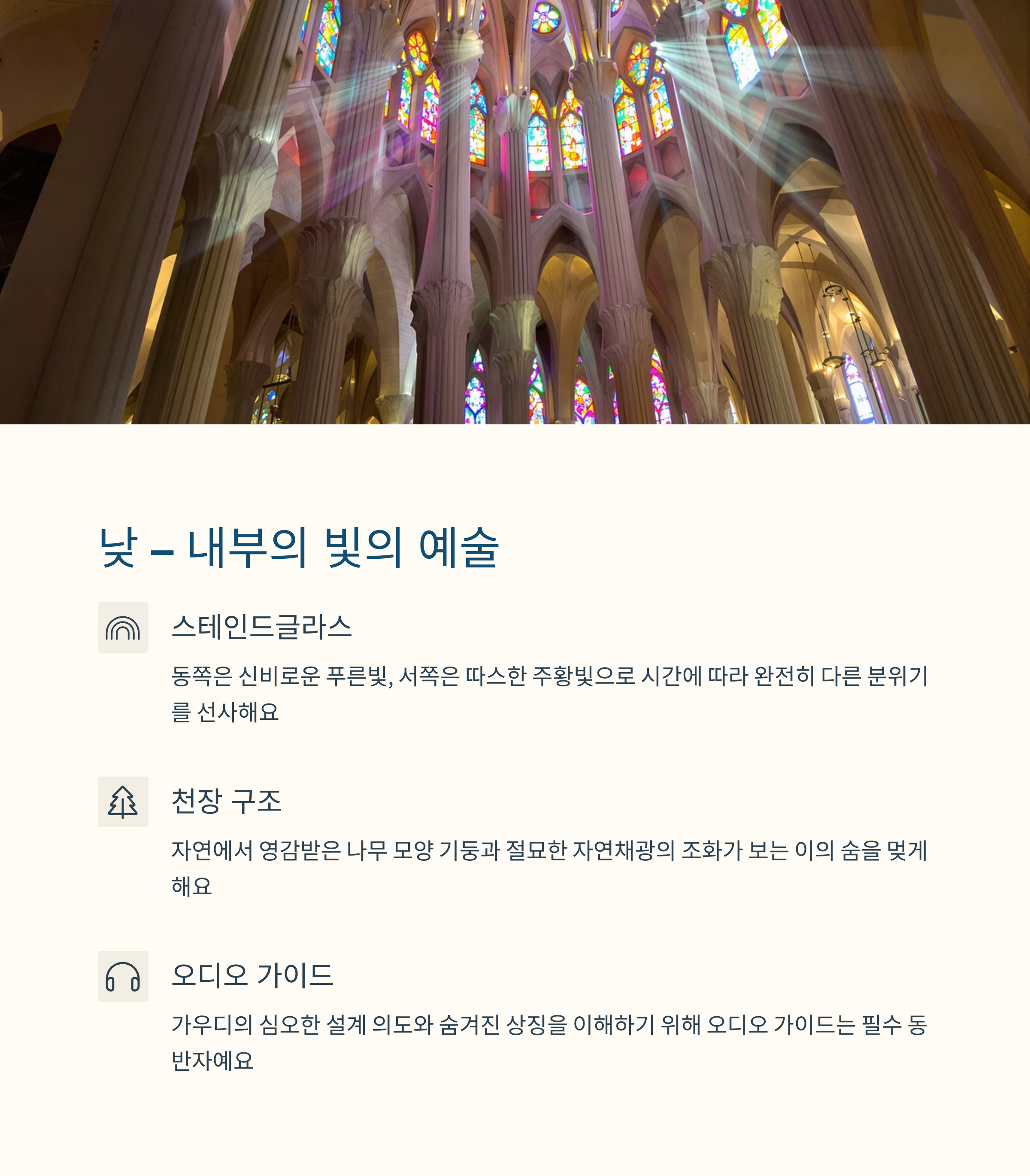 | 오디오 가이드 | 가우디의 설계 의도와 상징 해설 필수예요 |
