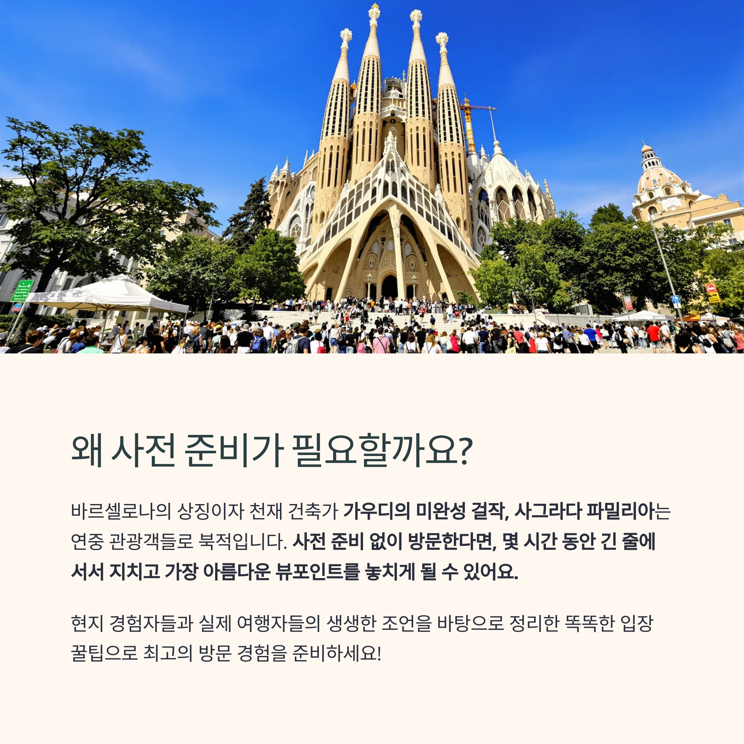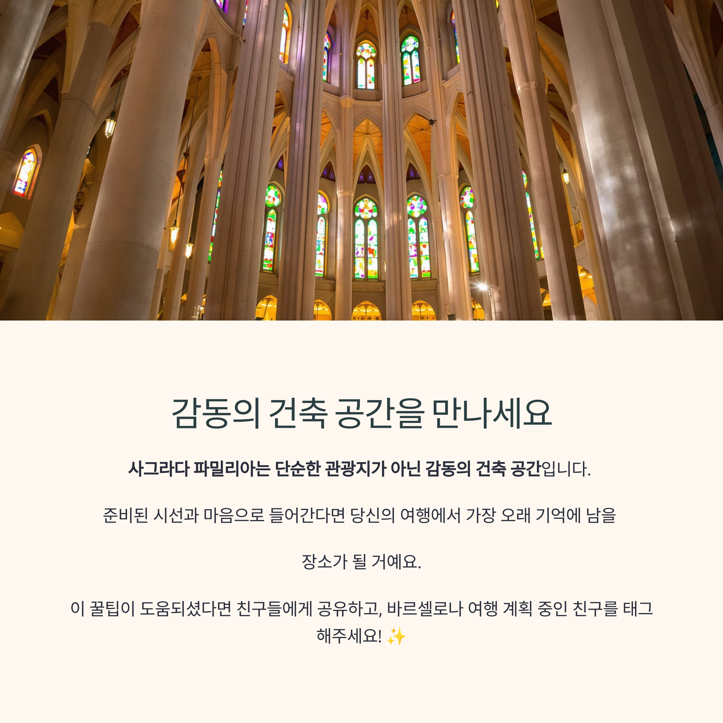 사그라다 파밀리아는 단순한 관광지가 아닌 감동의 건축 공간입니다.