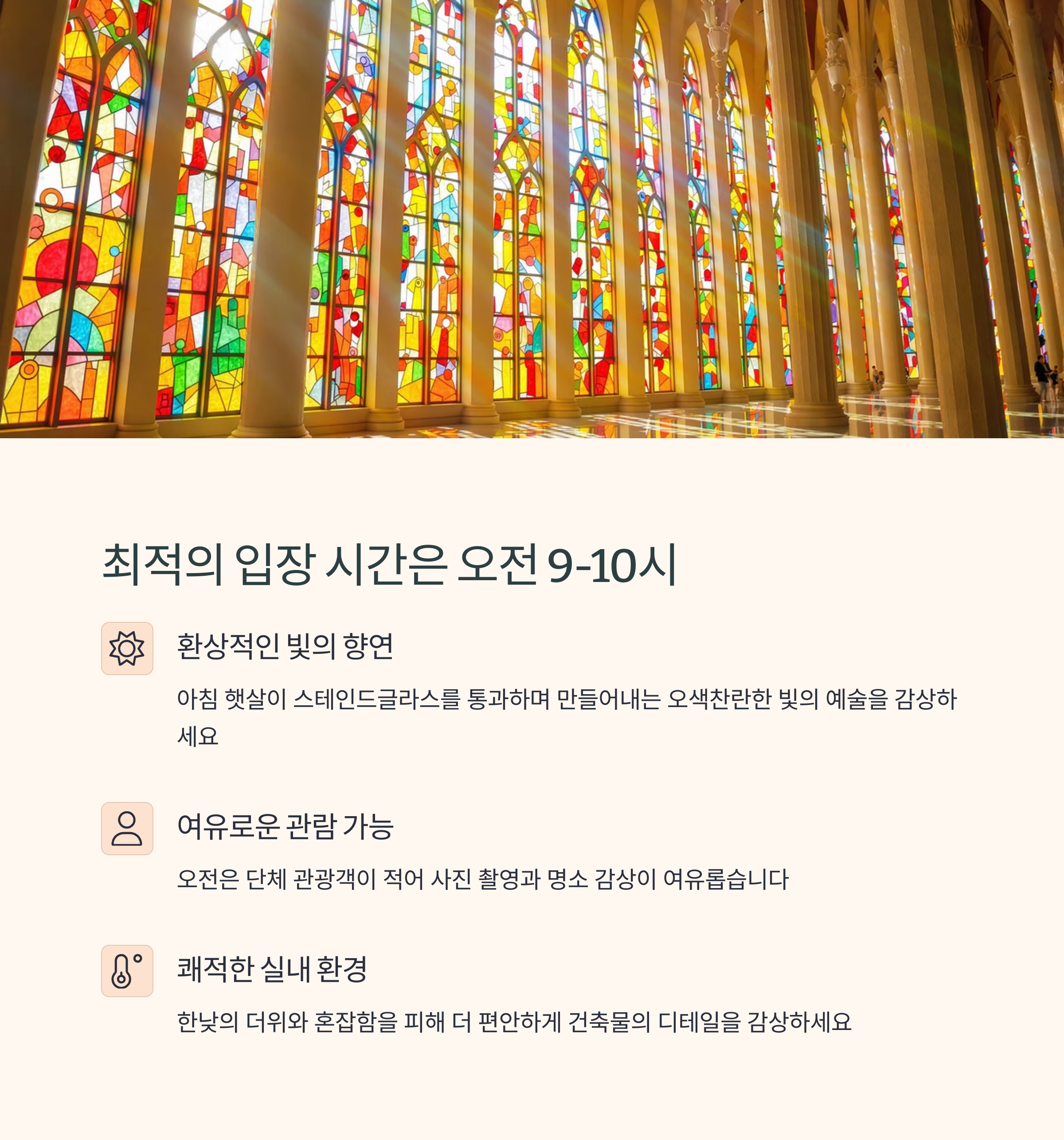 햇살이 스테인드글라스 창으로 들어오는 아침 시간대가
