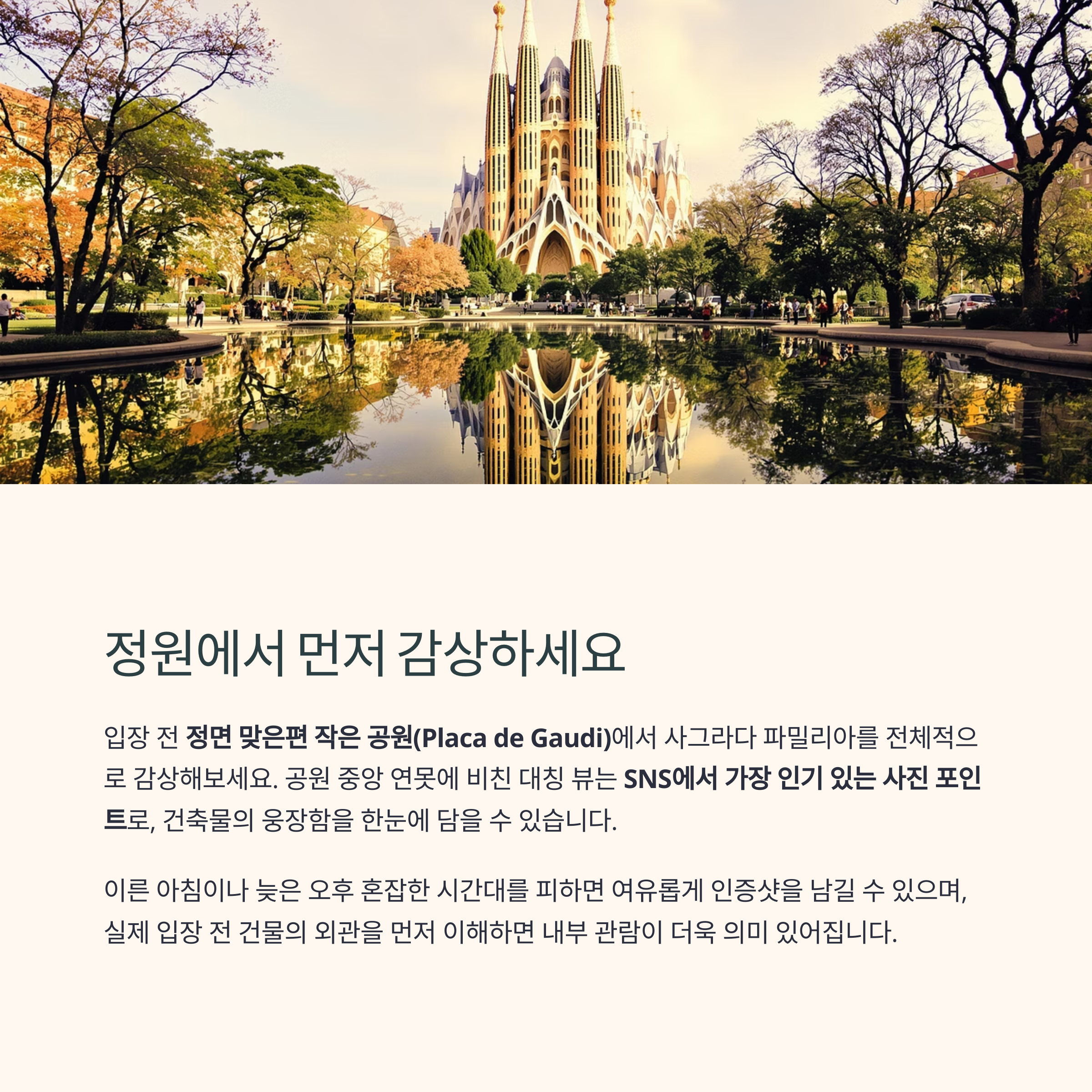 입장 전에는 꼭 **정면 맞은편의 작은 공원(Placa de Gaudi)**에서