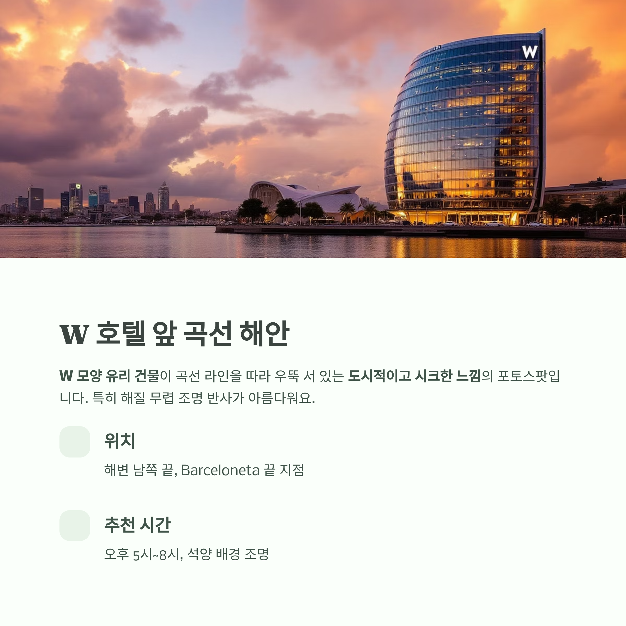 ② W 바르셀로나 호텔 앞 곡선 해안 – 럭셔리 감성 포인트