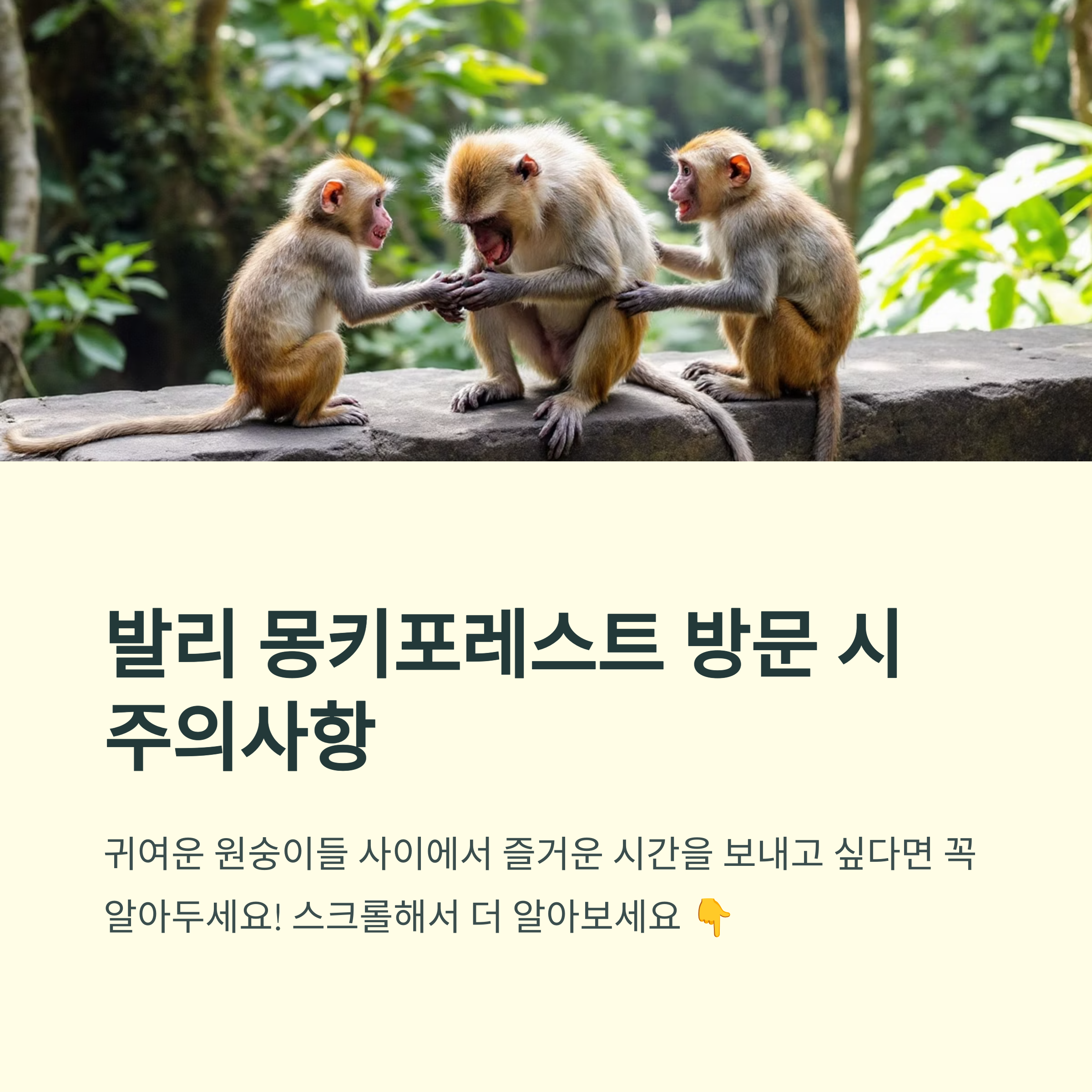 몽키 포레스트에서 꼭 조심해야 할 상황들을 정리해봤어요.