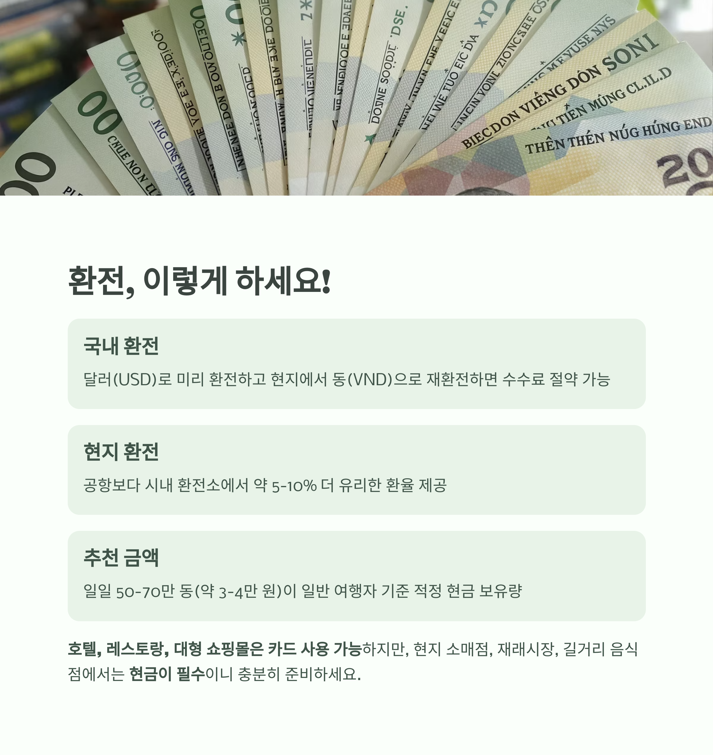 베트남 화폐 단위는 **동(VND)**이며, 현지에서는 현금 사용 비중이 여전히 높습니다.