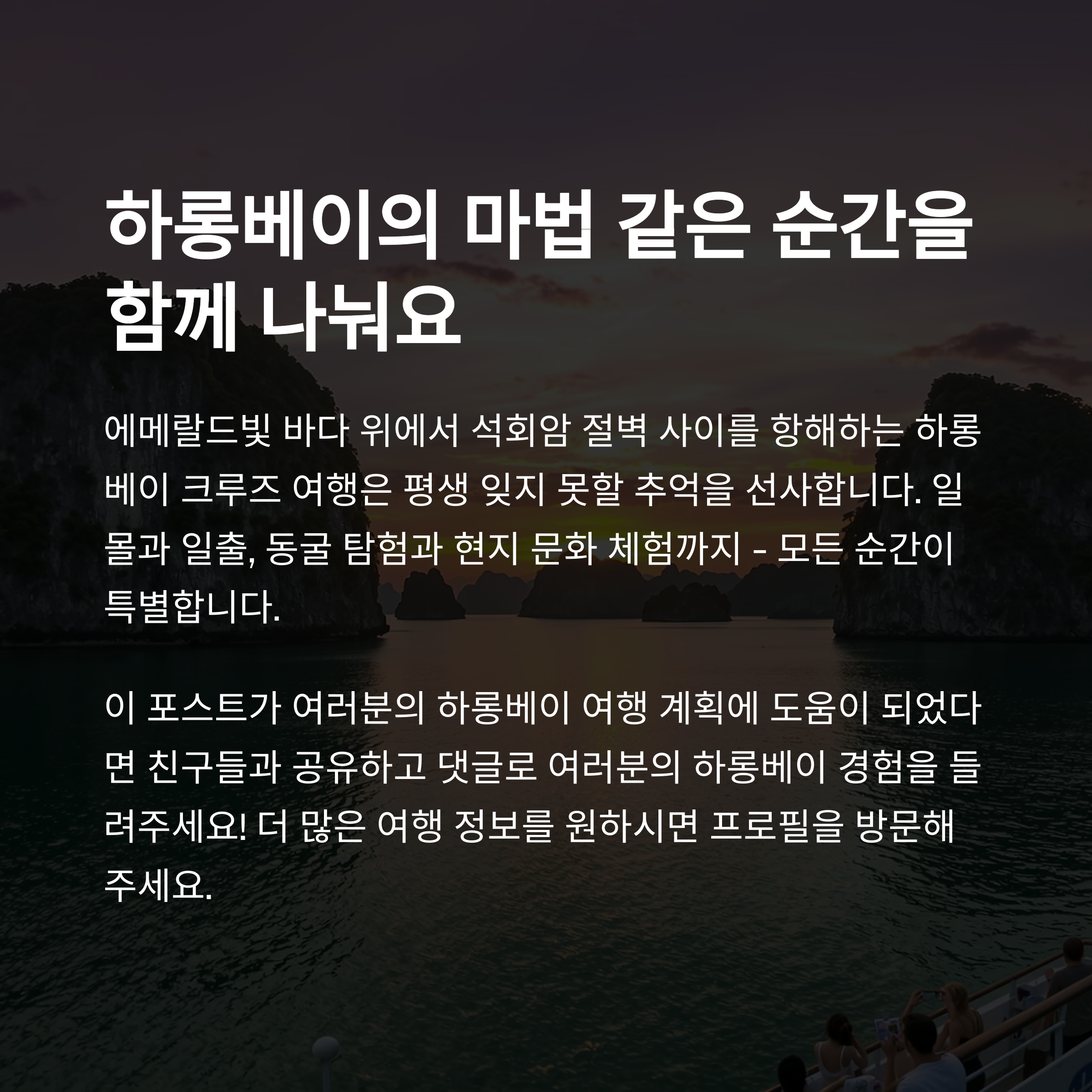 이번 글에서는 실제 체험을 바탕으로 하롱베이 크루즈의 추천 일정과 팁을 정리해 드릴게요.