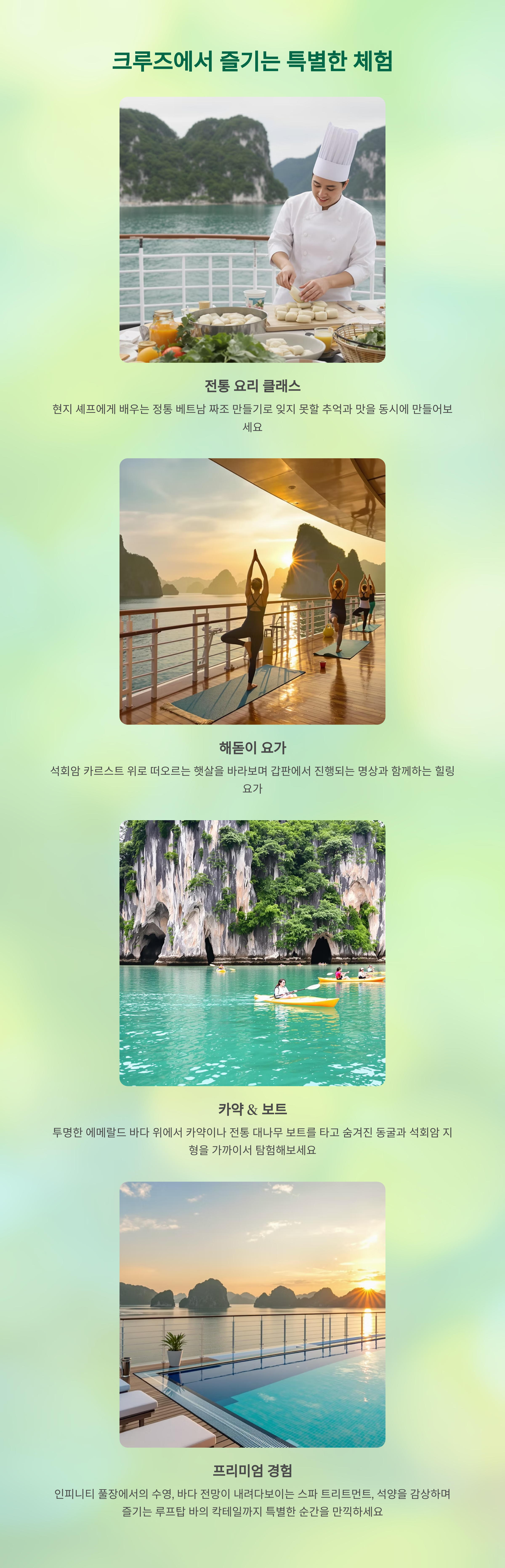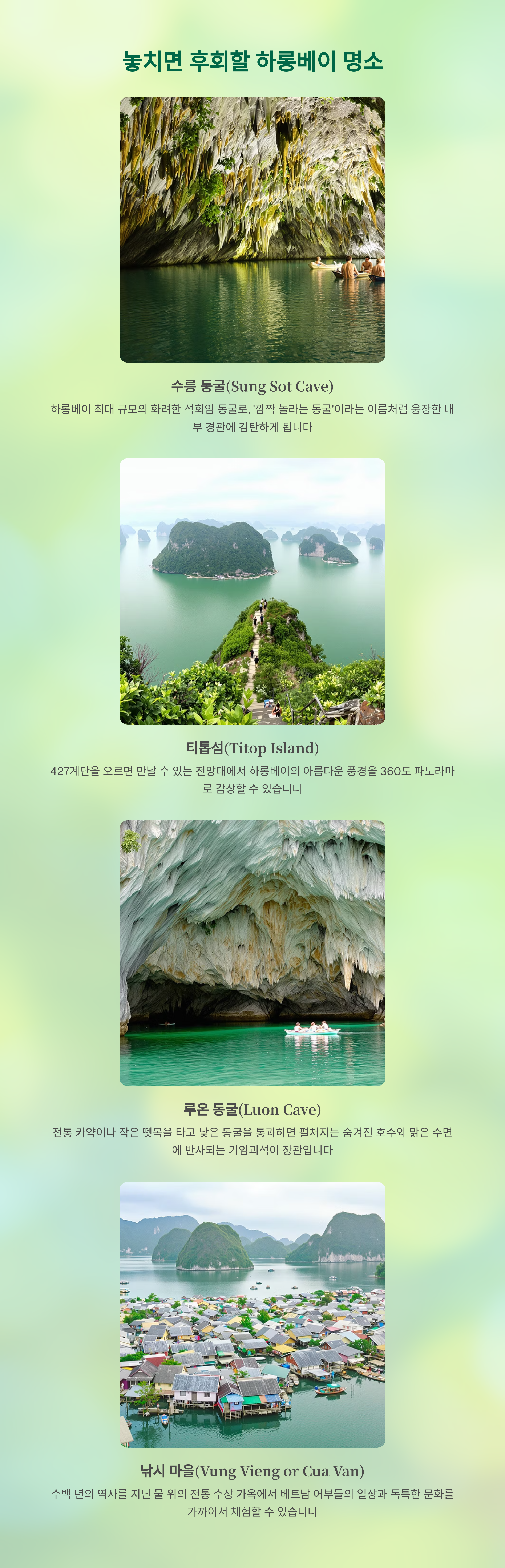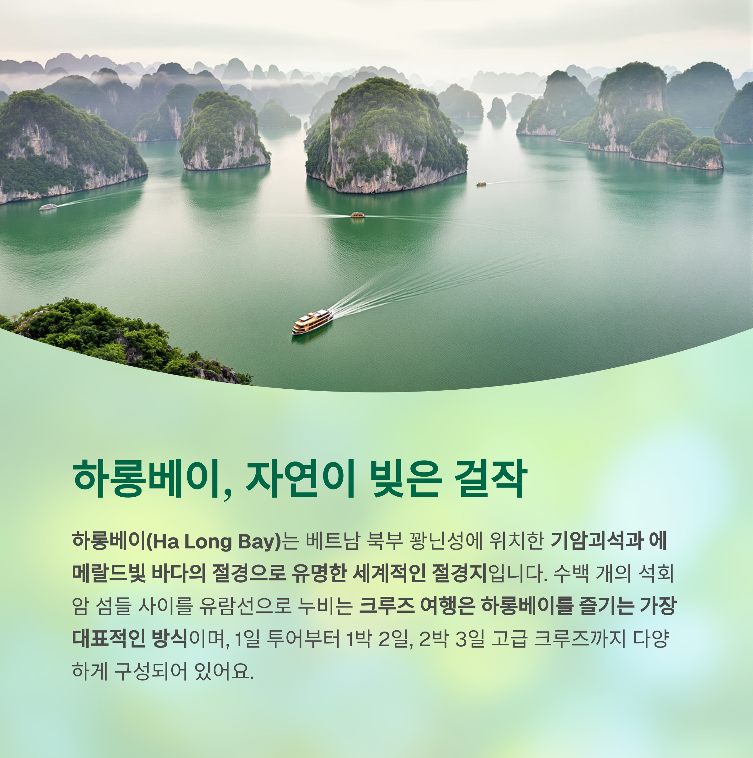 이번 글에서는 실제 체험을 바탕으로 하롱베이 크루즈의 추천 일정과 팁을 정리해 드릴게요.