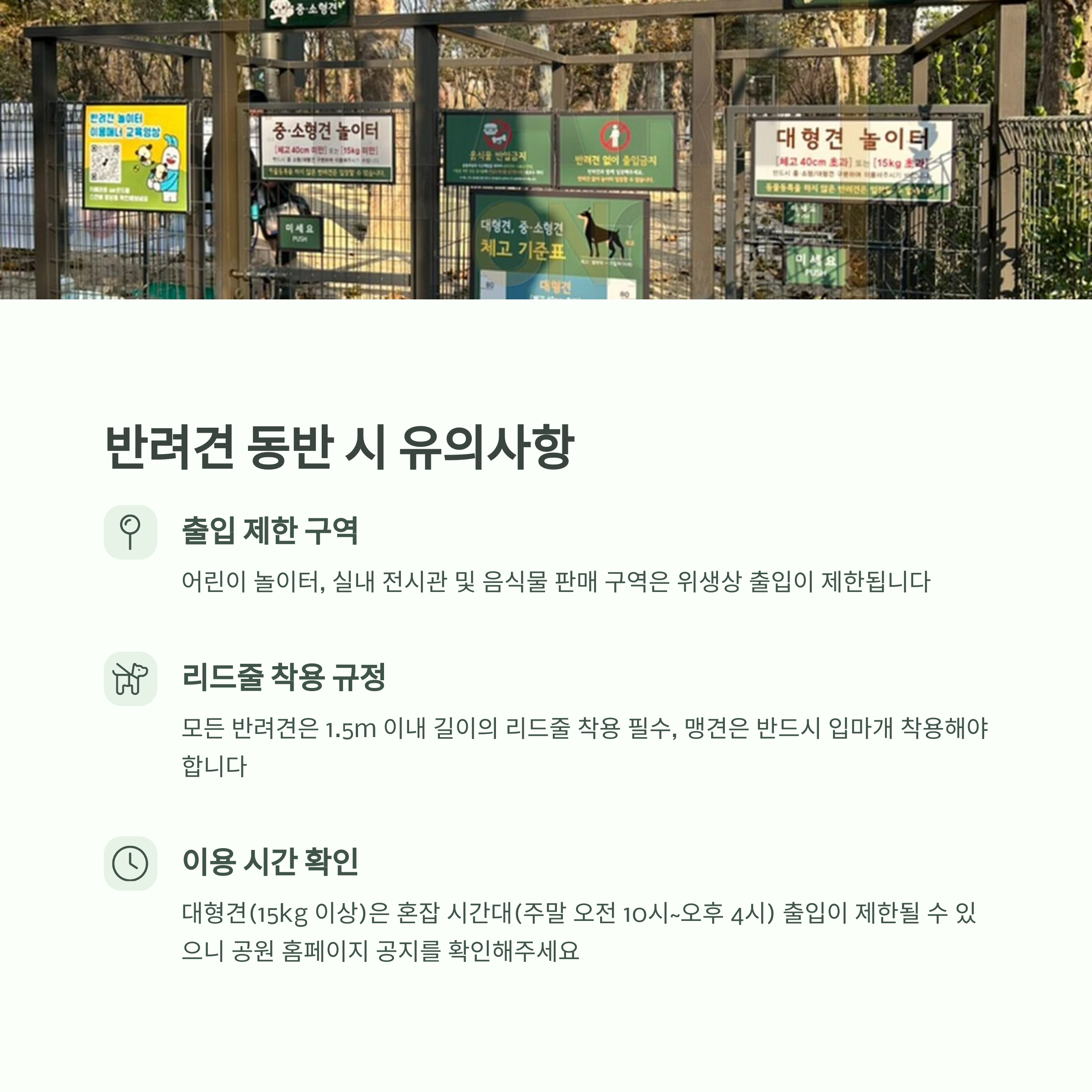 - 대형견 출입은 시간대 제한이 있을 수 있으니 공원 공지 확인 필요