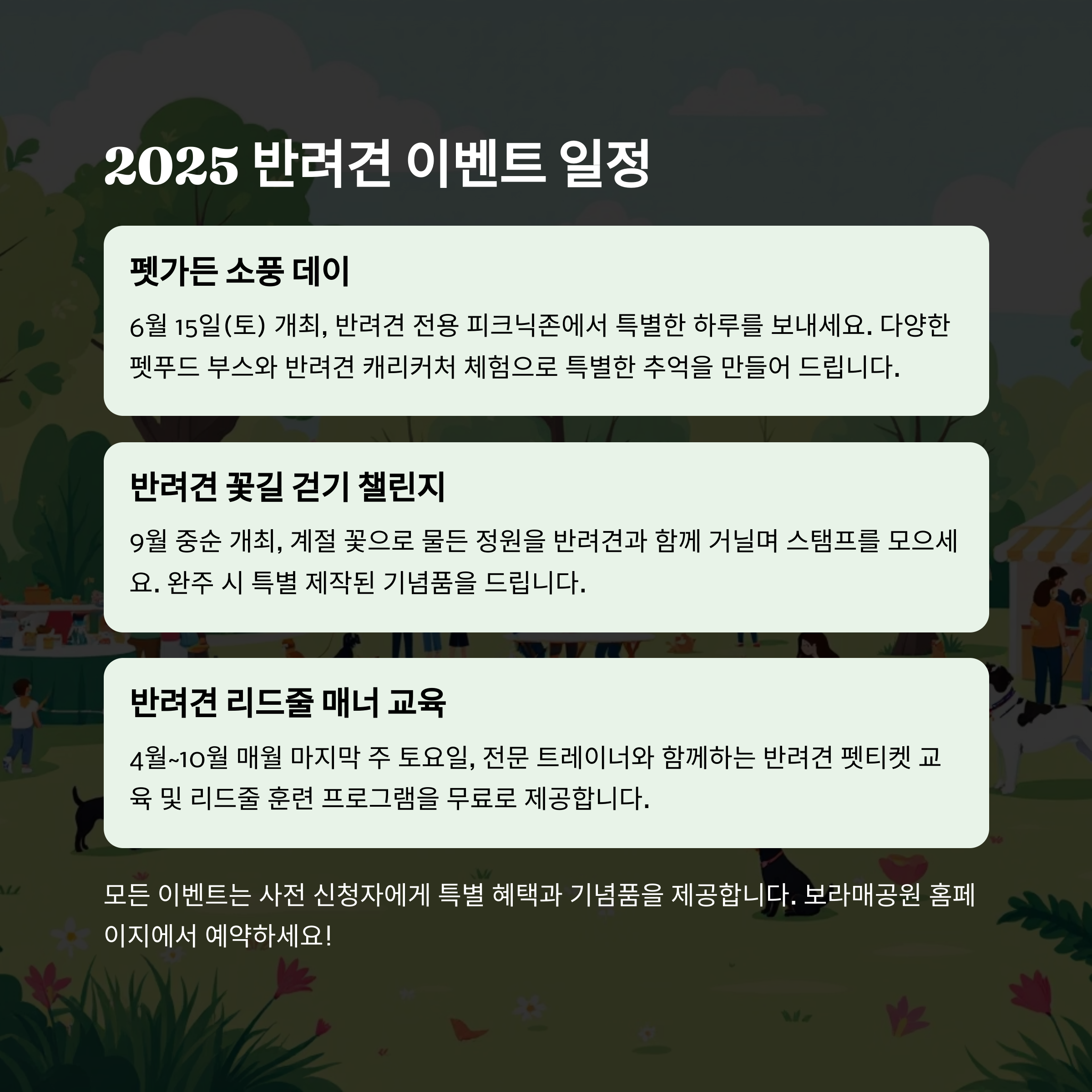 | 펫가든 소풍 데이 | 6월 15일(토) 예정 | 반려견 전용 피크닉존, 펫푸드 부스, 캐리커처 체험 등 |